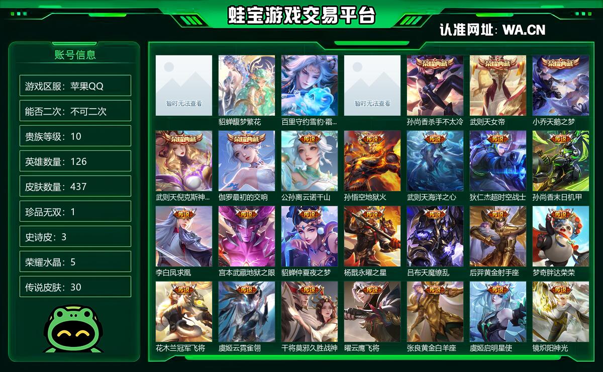 苹果QQ 不可二次 贵族10 段位无双王者 皮肤价值367372 英雄数量126 皮肤数量437 荣耀水晶5 传说皮肤30 珍品3 限定皮肤37 无双皮肤2 内测2 赛季皮肤31 史诗皮肤64 普通皮肤42 其他343