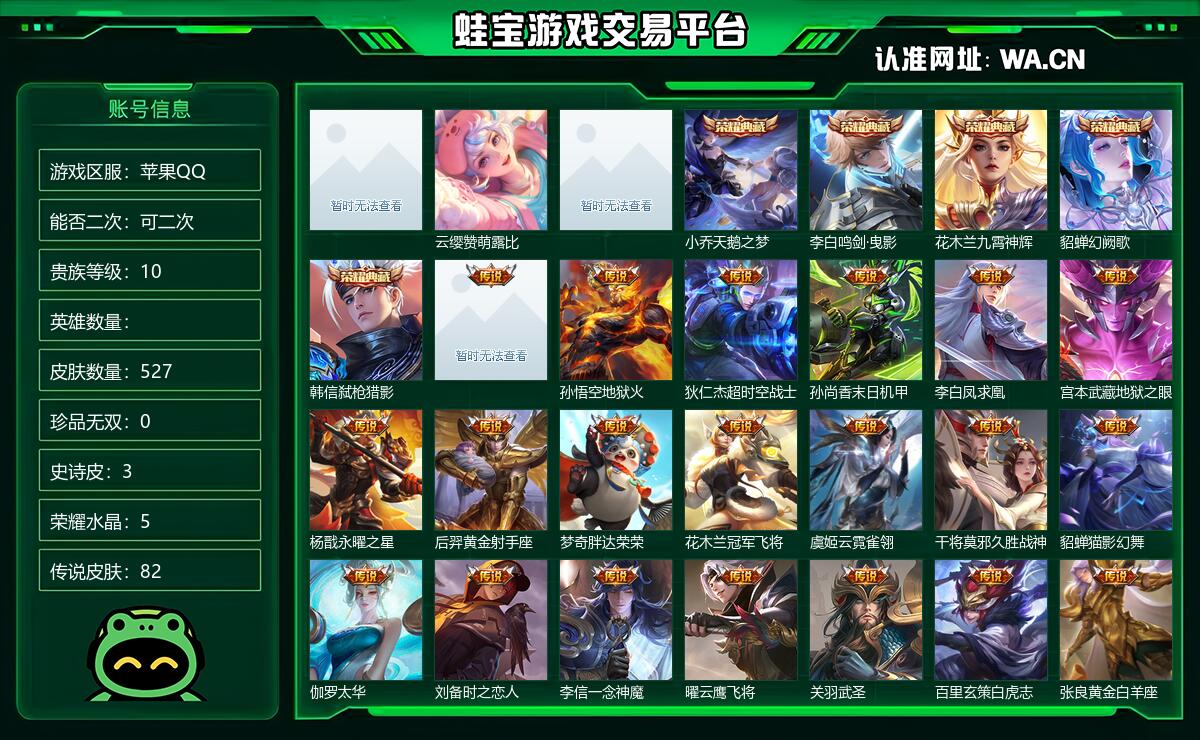 苹果QQ 可二次 贵族10 段位荣耀黄金IV 皮肤价值527308 英雄数量 皮肤数量527 荣耀水晶5 传说皮肤82 珍品1 限定皮肤61 无双皮肤2 内测5 赛季皮肤31 史诗皮肤71 普通皮肤54 其他337