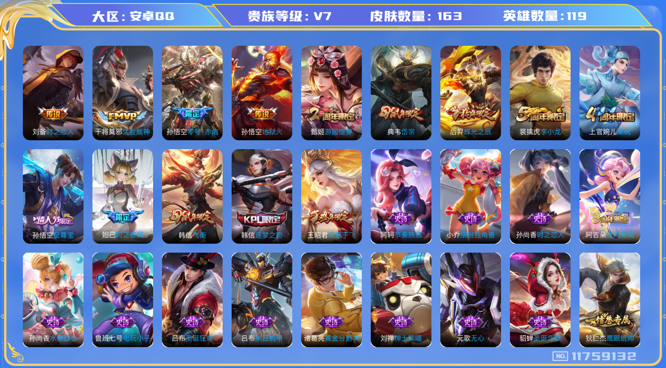- PX_2095933-实名: 可修改 贵族等级: V7 英雄数: 123 皮肤数: 184 星传说: 未来机甲 传说皮: 一念神魔,末日机甲-孙尚香,李逍遥,燃星之曲 限定皮: 遇见飞天,游园惊梦,龙胆,神威,青春决赛季,孙行者,女儿国国王,启示之音,五谷丰年,怒海麟威