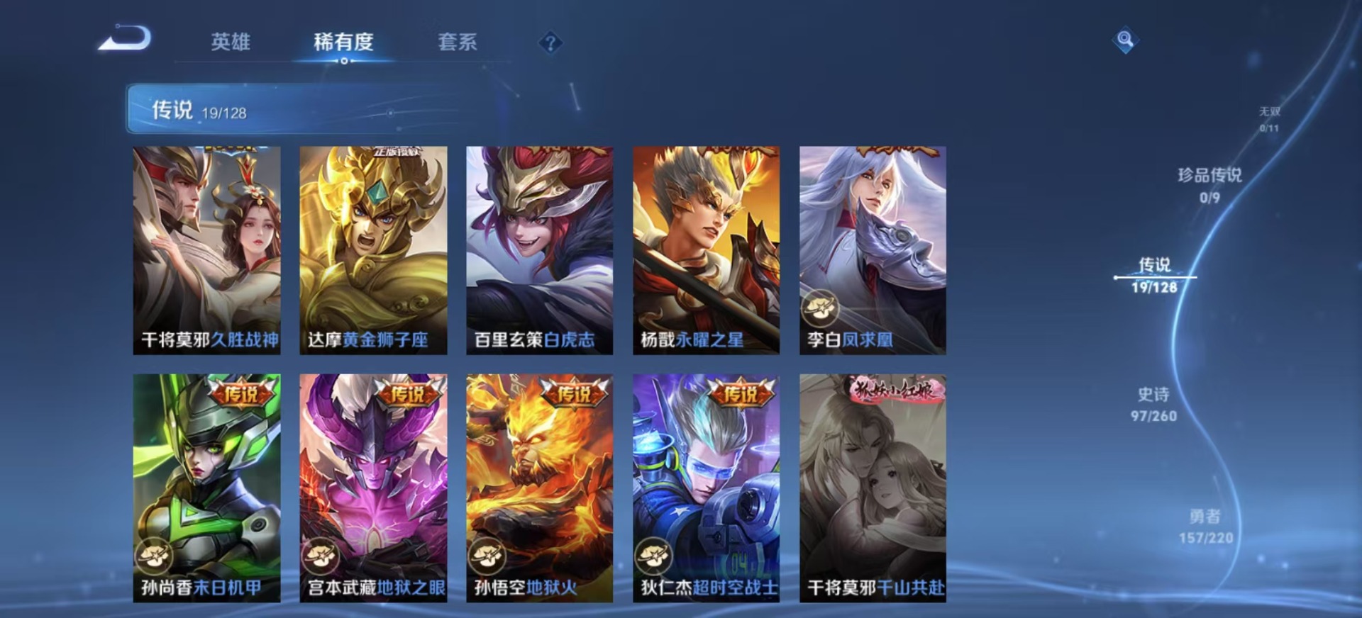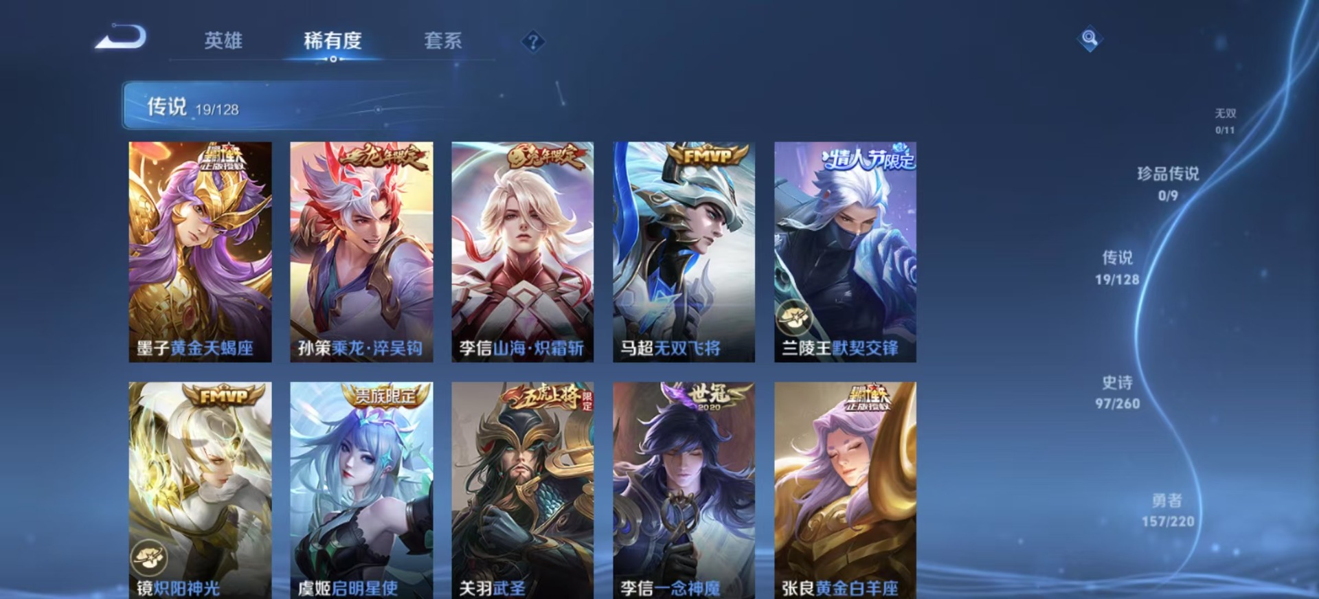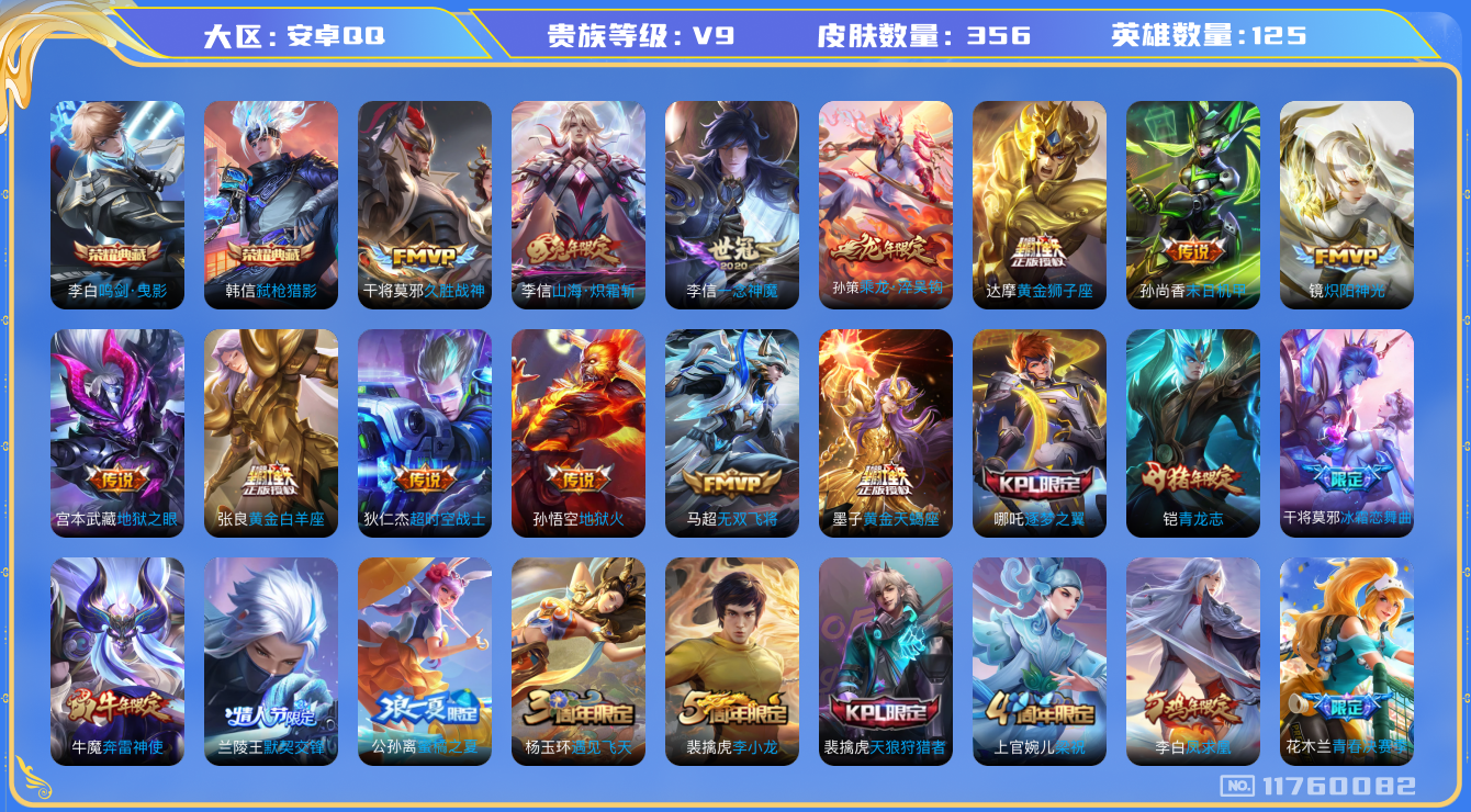 [11760082]V9 2典藏 19传说 125英雄 356皮肤 可修改实名 优质装备:鸣剑·曳影,弑枪猎影(韩信典藏),黄金狮子座,黄金白羊座,久胜战神,炽阳神光,一念神魔,末日机甲-孙尚香(绿蚂蚱),地狱火,地狱之眼,超时空战士-狄仁杰,无双飞将,山海·炽霜斩(李信年限),黄金天蝎座,涂山容容 传说皮:乘龙·淬吴钩(孙策年限) 珍宝阁皮:优雅恋人,女武神,玩趣恶龙 限定皮:至尊宝,白虎志(电光耗子),凤求凰(白切鸡),遇见飞天,五谷丰年,青龙志(铠年限),冰锋战神,武圣,梁祝,天狼狩猎者,逐梦之翼,逐梦之星,奔雷神使(牛魔年限),李小龙,逐梦之影,朱雀志(守约年限),永曜之星,默契交锋-兰陵王,大圣娶亲,引擎之心,青春决赛季,冰霜恋舞曲,蜜橘之夏,美猴王 史诗皮:鸭鸭历险记-刘禅,化蝶舞,灵蛊蚀心,星界战将,龙之律动,石田雨龙,百相守梦-周瑜,茶境仙,海诺心动手记,琥珀纪元伽罗,乘龙·聚宝船(安琪拉年限),百相守梦-黄忠,紫霞仙子,苍穹之光,电玩小子(小书包),白龙吟,黄金分割率,特工魅影,千年之狐,江河有灵,魅语,蒙恬荣光圣徽,冰冠公主,偶像歌手,晚萤,末日机甲-吕布,猫狗日记-孙策,猫狗日记-大乔,乱世虎臣,节奏热浪,修罗,女仆咖啡,摇滚巨星,水果甜心,绅士熊喵,天才门将,星夜王子,心灵骇客,功夫厨神,德古拉伯爵,暗隐猎兽者,幽灵船长,鬼剑武藏,心灵战警,天秀·启明,舞动绿茵,地狱岩魂,纤云弄巧,繁星吟游(呼啦呼啦),缤纷独角兽,乘风破浪,逐浪之夏,水晶猎龙者,曙光守护者,箭羽风息,金属风暴,原初追逐者,圣诞狂欢,圣诞恋歌,鹰眼统帅,暗夜贵公子,魅力维加斯,黎明之约,赏金猎手,无心,未来纪元-赵云