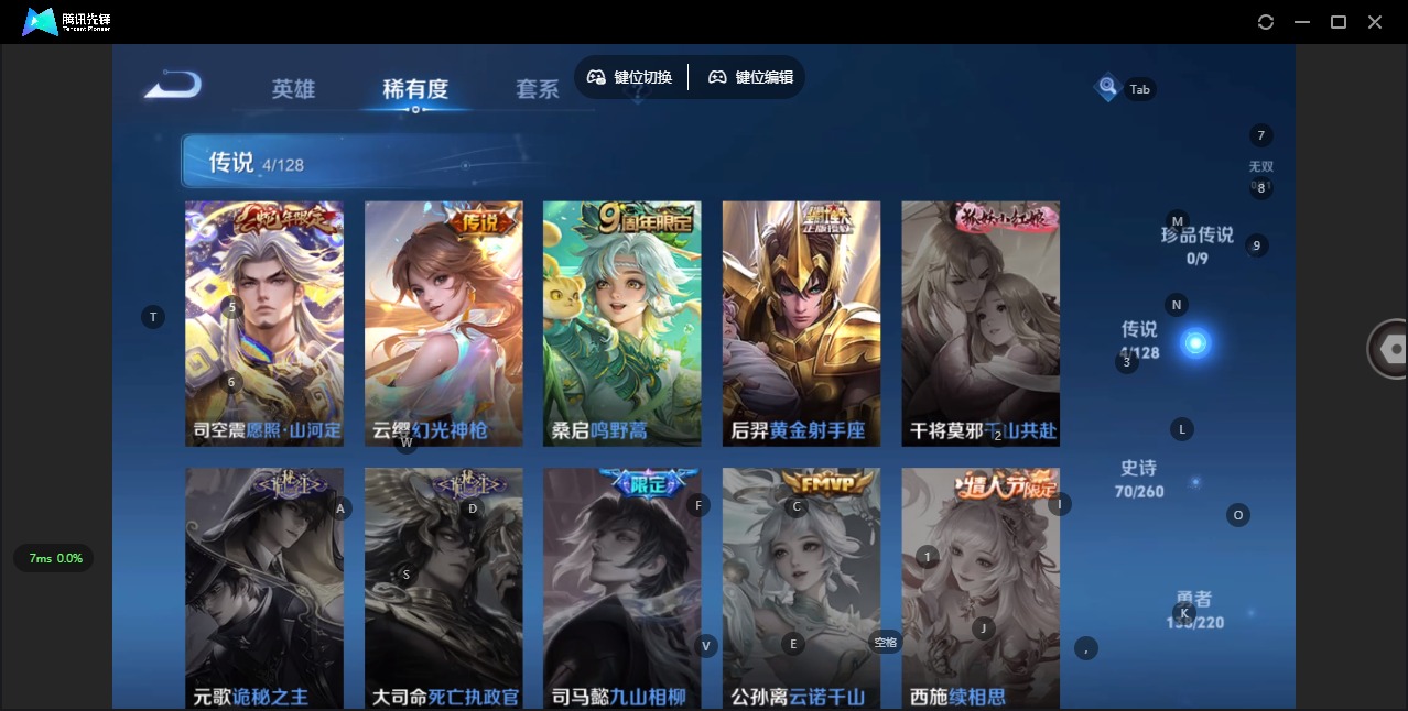 - [11675997]V8 1典藏 2无双 3珍品传说 17传说 125英雄 222皮肤 可修改实名 优质装备:鸣剑·曳影,器灵·螭龙剑,天机白泽,江户川柯南,怪盗基德,云鹰飞将(小将军),黄金白羊座,云霓雀翎,飞鸢探春,淬星耀世,妄想实况,澜逐花归海,涂山容容 珍品传说:兔狲·蓬尾 传说皮:死亡执政官,九山相柳,幻光神枪 珍宝阁皮:蔷薇恋人 限定皮:愿照·九州拓(澜年限),愿照·岁时盈(虞姬年限),逐霄战戟,映山客,陌上桑,鸣野蒿,遇见飞天,诗剑行,齐天大圣,天狼运算者,梁祝 史诗皮:器灵·浮梦炉,化蝶舞,谪仙醉月,龙之律动,破空之剑,战舞者,东方月初,埋骨钱,百相守梦-百里守约,百相守梦-黄忠,织梦人,紫霞仙子,特工魅影,千年之狐,冰冠公主,龙骑士(小龙虾),末日机甲-吕布,猫狗日记-孙策,乱世虎臣,节奏热浪,摇滚巨星,水果甜心,绅士熊喵,星夜王子,心灵骇客,功夫厨神,德古拉伯爵,暗隐猎兽者,鬼剑武藏,心灵战警,舞动绿茵,地狱岩魂,繁星吟游(呼啦呼啦),缤纷独角兽,逐浪之夏,箭羽风息,圣诞恋歌,鹰眼统帅,暗夜贵公子,魅力维加斯