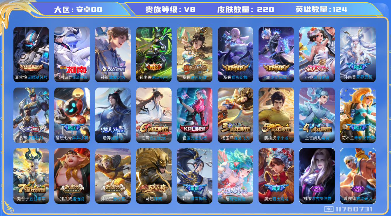 - [12041434]【特价急出/详情看图】:安卓Q-V6-至尊星耀IV段位-123英雄-162皮肤-1典藏-3传说-47史诗 【荣耀典藏】:韩信弑枪猎影 【传说皮肤】:云缨幻光神枪,貂蝉猫影幻舞,达摩黄金狮子座 【限定皮肤】:姜子牙天穹之誓,狄仁杰阴阳师,赵云皇家上将,孙尚香蔷薇恋人,白起夜都怪侠,芈月幻夜卜梦,夏侯惇朔风刀,马可波罗暗影游猎,狄仁杰魔术师,狄仁杰万华元夜,达摩沙漠行僧,项羽海滩派对,老夫子醍醐杖,程咬金演武夺筹,韩信傲雪梅枪,兰陵王金庭之子,后羿圣弓游侠,李元芳云中旅人,钟馗驱傩正仪,杨玉环遇见飞天,干将莫邪真爱魔法,雅典娜黎明之约,鬼谷子原初探秘者,黄忠火炮绅士,苏烈千军破阵,百里玄策原初追逐者,弈星混沌棋,梦奇顽趣,沈梦溪大漠名商,明世隐疑决卦,明世隐吟游魔法,裴擒虎李小龙,裴擒虎擒涛扼浪,猪八戒西部大镖客,上官婉儿梁祝,嫦娥暖冬兔眠,鲁班大师探海日志,桑启海盐诗旅,暃星界游侠,张良古海寻踪,蒙恬荣光圣徽,高渐离燃音魔法,妲己灵卜魔法,鬼谷子天穹祈灯,沈梦溪龙舞盛年,刘邦剑破天穹,周瑜熔金海岸 【赛季限定】:夏侯惇朔风刀,狄仁杰万华元夜,达摩沙漠行僧,老夫子醍醐杖,程咬金演武夺筹,兰陵王金庭之子,张良古海寻踪,李元芳云中旅人,钟馗驱傩正仪,雅典娜黎明之约,鬼谷子原初探秘者,苏烈千军破阵,百里玄策原初追逐者,弈星混沌棋,梦奇顽趣,沈梦溪大漠名商,明世隐疑决卦,裴擒虎擒涛扼浪,鲁班大师探海日志,桑启海盐诗旅,鬼谷子天穹祈灯,蒙恬荣光圣徽,刘邦剑破天穹,姜子牙天穹之誓 【战令限定】:白起夜都怪侠,芈月幻夜卜梦,马可波罗暗影游猎,后羿圣弓游侠,干将莫邪真爱魔法,黄忠火炮绅士,明世隐吟游魔法,猪八戒西部大镖客,嫦娥暖冬兔眠,暃星界游侠,高渐离燃音魔法,妲己灵卜魔法 【史诗皮肤】:鲁班七号电玩小子,赵云皇家上将,赵云未来纪元,貂蝉圣诞恋歌,甄姬冰雪圆舞曲,王昭君偶像歌手,狄仁杰魔术师,宫本武藏鬼剑武藏,孙尚香蔷薇恋人,孙尚香水果甜心,妲己魅力维加斯,妲己女仆咖啡,墨子金属风暴,刘禅绅士熊喵,曹操幽灵船长,吕布末日机甲,张飞乱世虎臣,夏侯惇乘风破浪,兰陵王暗隐猎兽者,雅典娜冰冠公主,百里守约特工魅影,铠曙光守护者,刘禅天才门将,李元芳逐浪之夏,白起星夜王子,阿轲节奏热浪,杨玉环遇见飞天,孙策猫狗日记,大乔猫狗日记,伽罗箭羽风息,狄仁杰鹰眼统帅,上官婉儿梁祝,马可波罗暗影游猎,