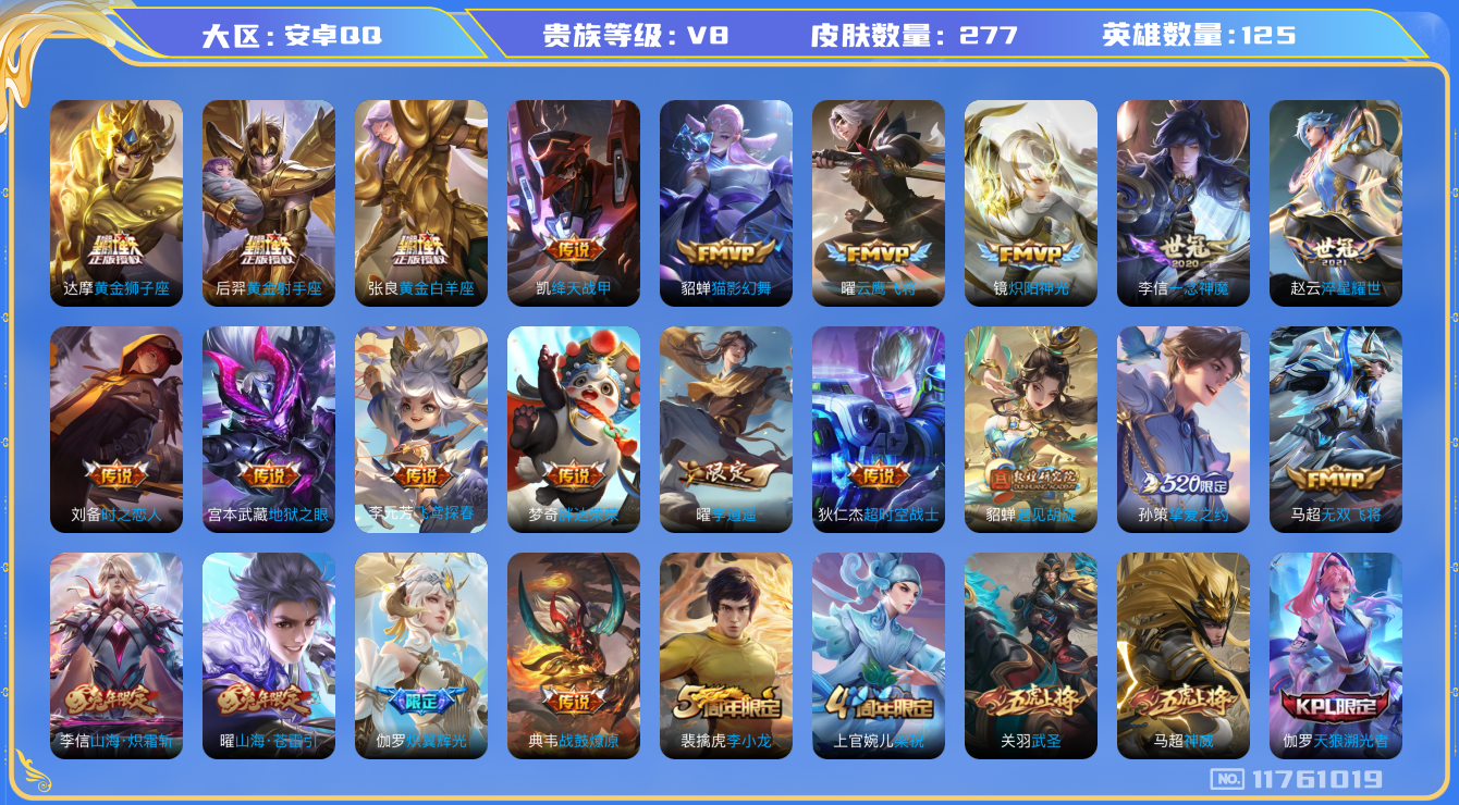 [11761019]【商品标题】:安卓Q-V8-永恒钻石I段位-125英雄-277皮肤-0典藏-0珍品无双-0无双-0珍品传说-33传说-78史诗