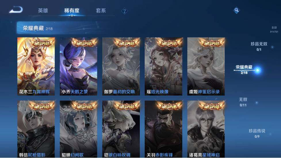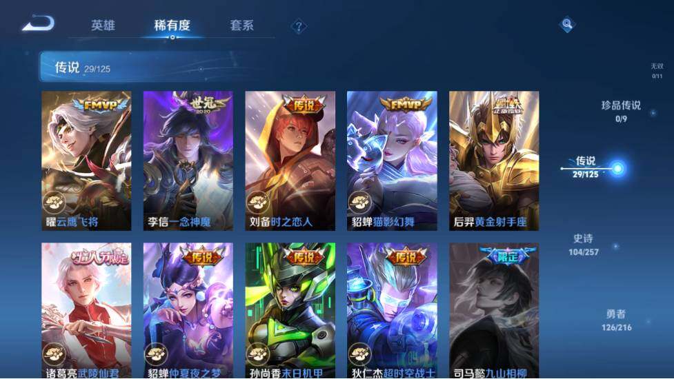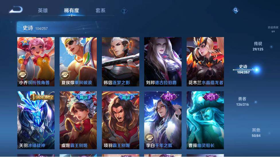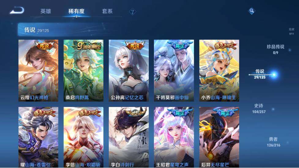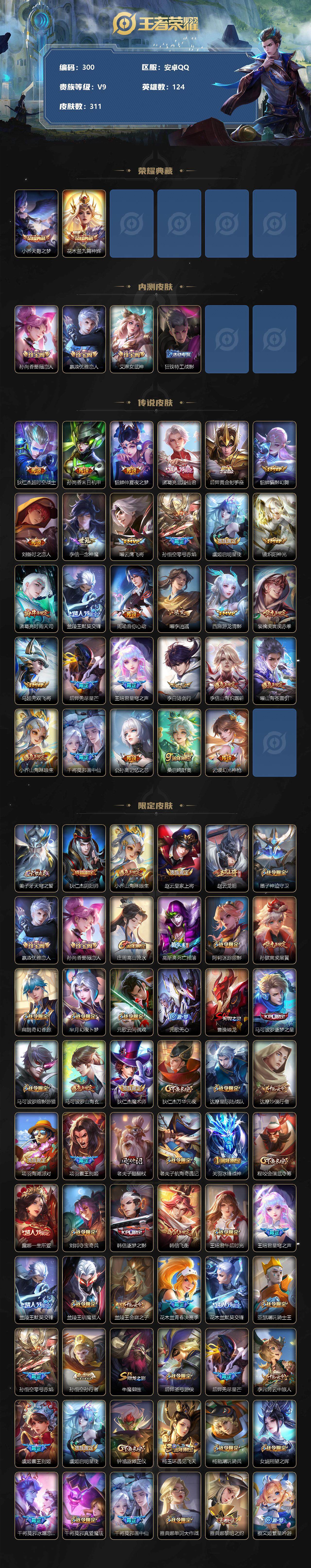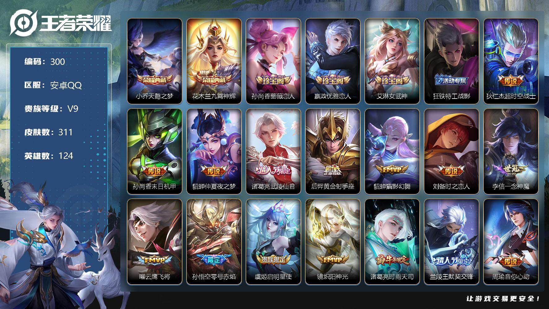 [11762015]【商品标题】:安卓Q-V9-至尊星耀IV段位-124英雄-311皮肤-2典藏-0珍品无双-0无双-0珍品传说-29传说-104史诗