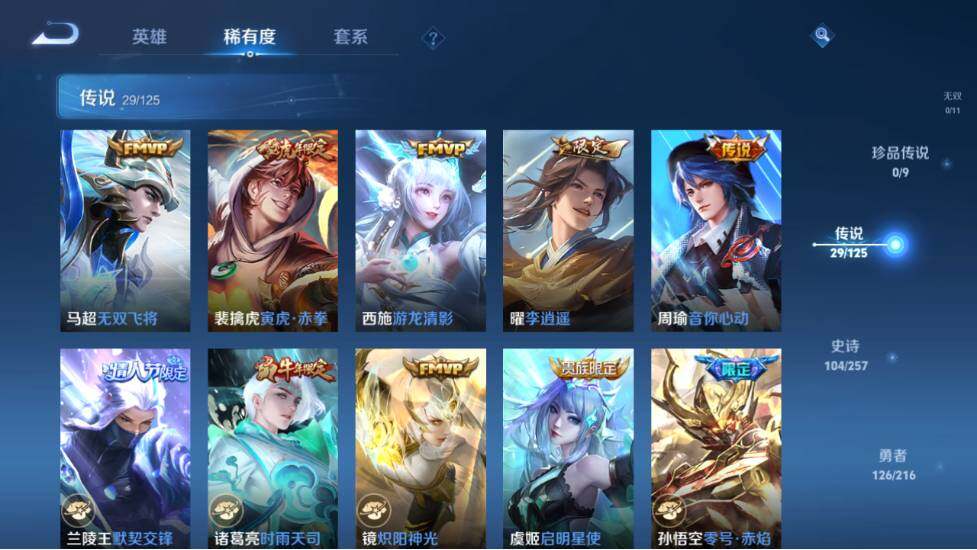 【传说皮肤】:狄仁杰超时空战士,孙尚香末日机甲,貂蝉仲夏夜之梦,诸葛亮武陵仙君,后羿黄金射手座,貂蝉猫影幻舞,刘备时之恋人,李信一念神魔,曜云鹰飞将,孙悟空零号赤焰,虞姬启明星使,镜炽阳神光,诸葛亮时雨天司,兰陵王默契交锋,周瑜音你心动,曜李逍遥 ,西施游龙清影,裴擒虎寅虎赤拳,马超无双飞将,后羿无尽星芒,王昭君星穹之声,李白诗剑行,李信山海炽霜斩,曜山海苍雷引,小乔山海琳琅生,干将莫邪画中仙,公孙离记忆之芯,桑启鸣野蒿,云缨幻光神枪
