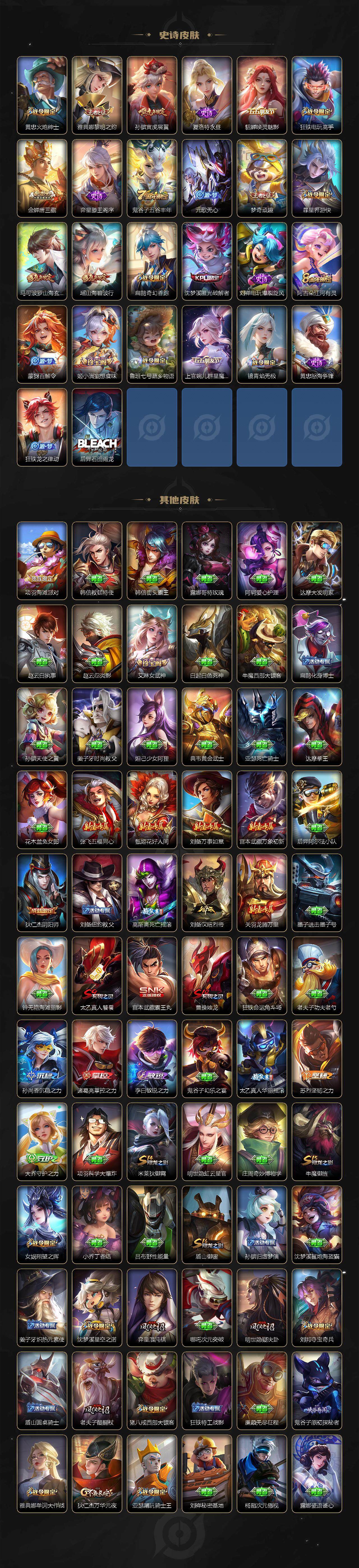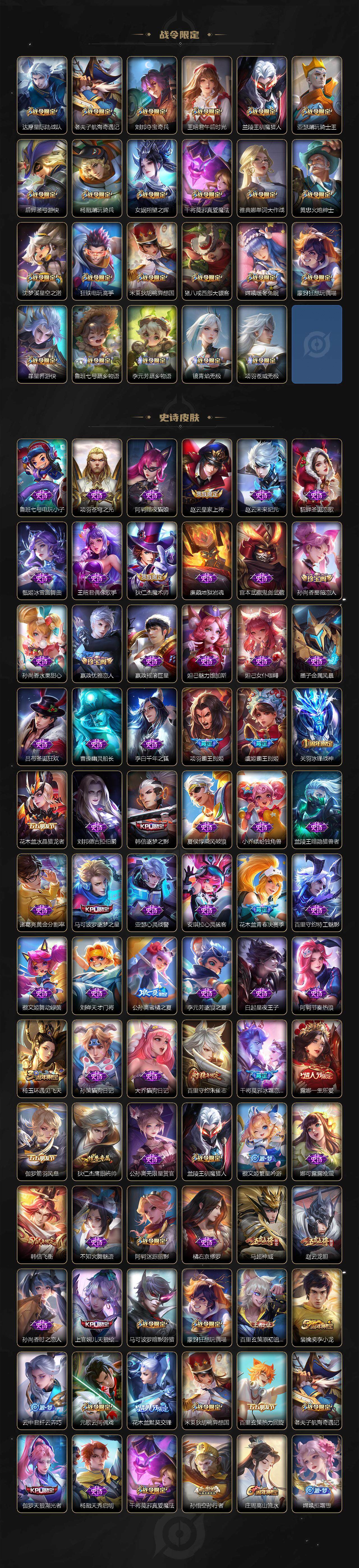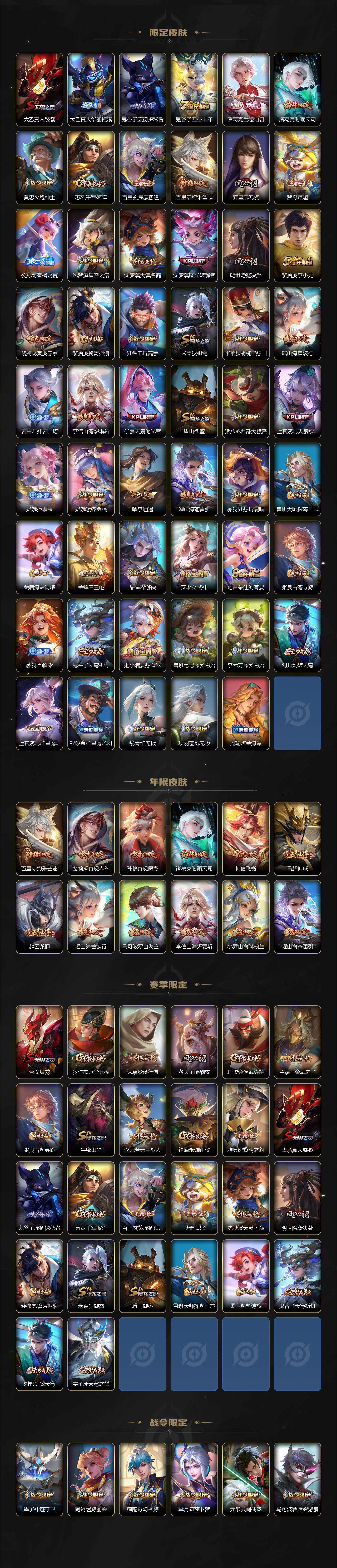 【限定皮肤】:姜子牙天穹之誓,狄仁杰阴阳师,小乔山海琳琅生,赵云皇家上将,赵云龙胆,墨子神迹守卫,嬴政优雅恋人,孙尚香蔷薇恋人,庄周高山流水,高渐离死亡摇滚,阿轲迷踪丽影,孙膑寅虎展翼,扁鹊奇幻香踪,芈月幻夜卜梦,元歌云间偶戏,元歌无心,曹操烛龙,马可波罗逐梦之星,马可波罗暗影游猎,马可波罗山海玄木吟,狄仁杰魔术师,狄仁杰万华元夜,达摩星际陆战队,达摩沙漠行僧,项羽海滩派对,项羽霸王别姬,老夫子醍醐杖,老夫子航海奇遇记,关羽冰锋战神,程咬金演武夺筹,露娜一生所爱,刘邦夺宝奇兵,韩信逐梦之影,韩信飞衡,王昭君午后时光,王昭君星穹之声,兰陵王默契交锋,兰陵王驯魔猎人,兰陵王金庭之子,花木兰青春决赛季,花木兰默契交锋,亚瑟潮玩骑士王,孙悟空零号赤焰,孙悟空孙行者,牛魔御旌,后羿圣弓游侠,后羿无尽星芒,李元芳云中旅人,虞姬霸王别姬,虞姬启明星使,钟馗驱傩正仪,杨玉环遇见飞天,杨戬潮玩骑兵,女娲朔望之晖,干将莫邪冰霜恋舞曲,干将莫邪真爱魔法,干将莫邪画中仙,雅典娜单词大作战,雅典娜黎明之约,蔡文姬繁星吟游,太乙真人饕餮,太乙真人华丽摇滚,鬼谷子原初探秘者,鬼谷子五谷丰年,诸葛亮武陵仙君,诸葛亮时雨天司,黄忠火炮绅士,苏烈千军破阵,百里玄策原初追逐者,百里守约朱雀志,弈星混沌棋,梦奇顽趣,公孙离蜜橘之夏,沈梦溪星空之诺,沈梦溪大漠名商,沈梦溪匿光破解者,明世隐疑决卦,裴擒虎李小龙,裴擒虎寅虎赤拳,裴擒虎擒涛扼浪,狂铁电玩高手,米莱狄御霄,米莱狄胡桃异想国,瑶山海碧波行,云中君纤云弄巧,李信山海炽霜斩,伽
