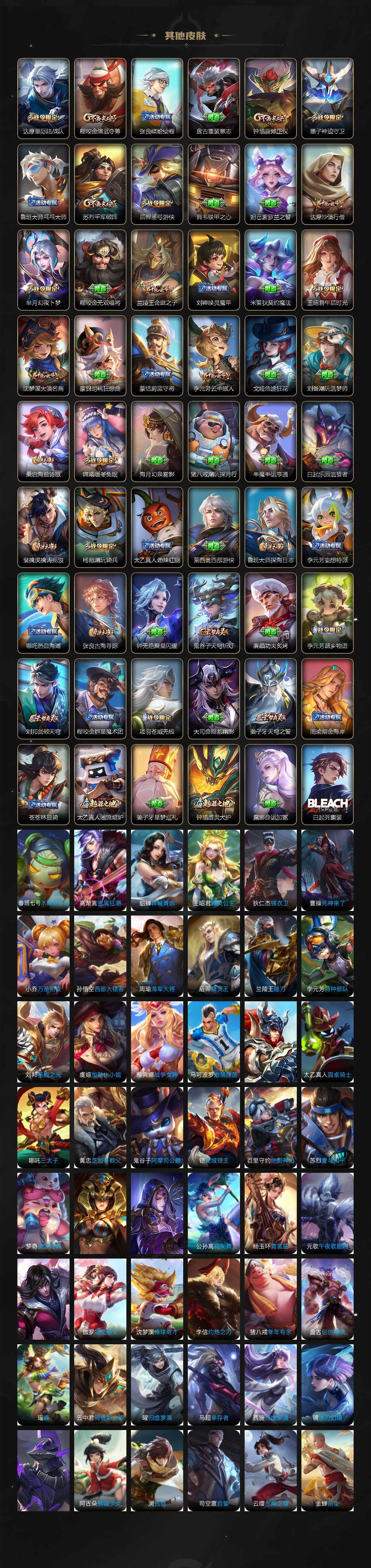 娜可露露晚萤,伽罗箭羽风息,李元芳逐浪之夏,不知火舞魅语,公孙离无限星赏官,大乔猫狗日记,孙策猫狗日记,阿轲节奏热浪,诸葛亮黄金分割率,王昭君偶像歌手,项羽苍穹之光,孙尚香时之恋人,阿轲暗夜猫娘,鲁班七号电玩小子,橘右京修罗,嬴政摇滚巨星,刘禅天才门将,白起星夜王子,安琪拉心灵骇客,刘邦德古拉伯爵,兰陵王暗隐猎兽者,曹操幽灵船长,宫本武藏鬼剑武藏,亚瑟心灵战警,杨戬天秀·启明,蔡文姬舞动绿茵,廉颇地狱岩魂,小乔缤纷独角兽,夏侯惇乘风破浪,花木兰水晶猎龙者,百里玄策热力回旋,墨子金属风暴,百里玄策原初追逐者,吕布圣诞狂欢,貂蝉圣诞恋歌,百里守约特工魅影,嫦娥拒霜思,雅典娜黎明之约,李白千年之狐,夏洛特永昼,貂蝉唤灵魅影,弈星滕王阁序,沈梦溪匿光破解者,刘禅电玩·爆裂旋风,蒙犽百解令,上官婉儿群星魔术团