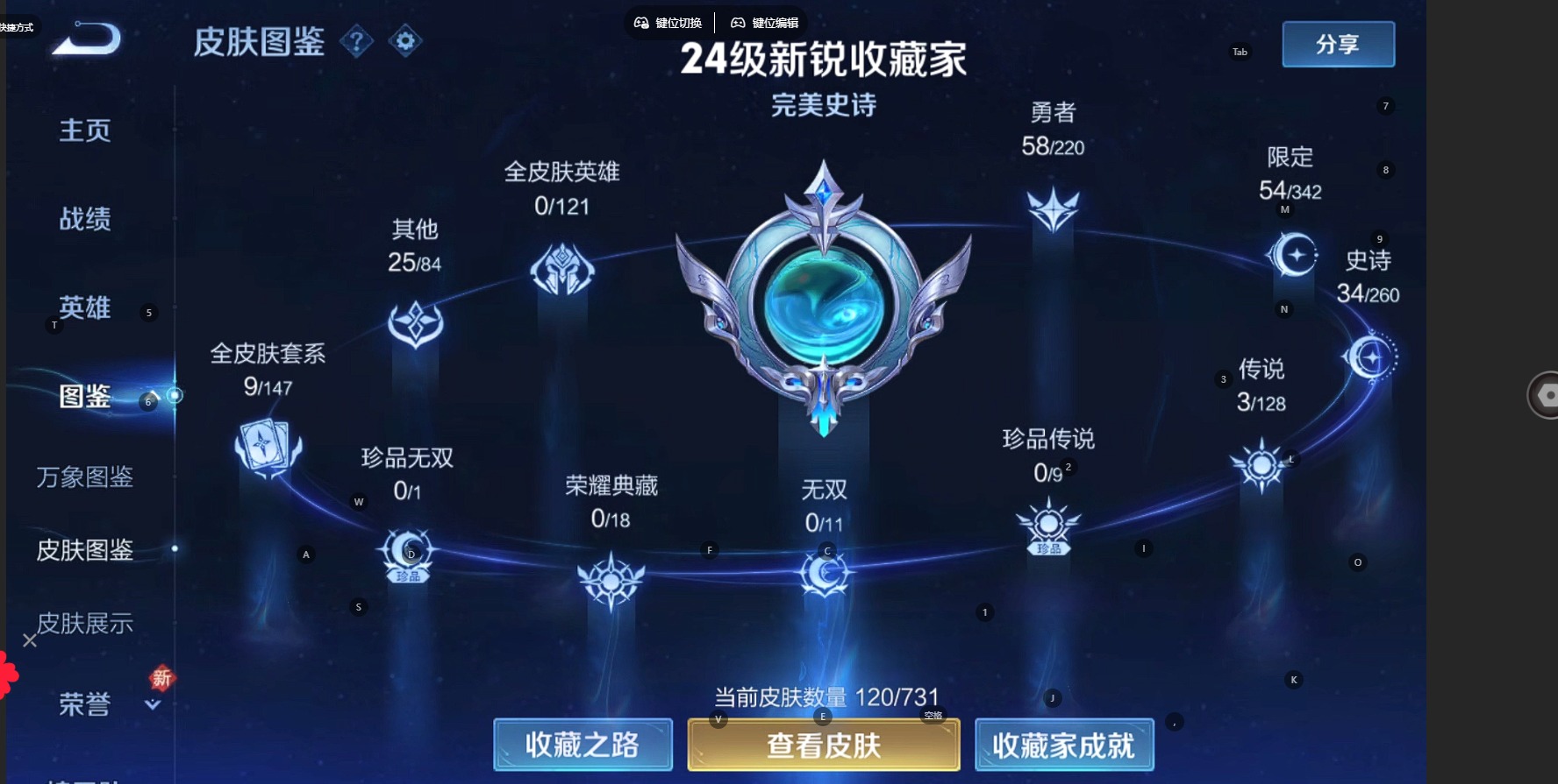- PX_2096929-贵族等级: V9 英雄数: 124 皮肤数: 325 荣耀水晶: 武则天,全息碎影 星传说: 未来机甲,金色仲夏夜 传说皮: 黄金射手座,猫影幻舞,久胜战神,一念神魔,末日机甲-孙尚香,仲夏夜之梦,零号·赤焰 限定皮: 冰锋战神,遇见飞天,李小龙,祈雪灵祝,游园惊梦,梁祝,武圣,天狼溯光者,神威,蜜橘之夏,永曜之星,飞衡,乒乒小将,太华,冰霜恋舞曲,逐梦之星,逐梦之影,凤求凰