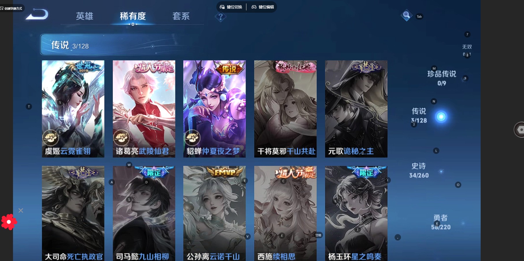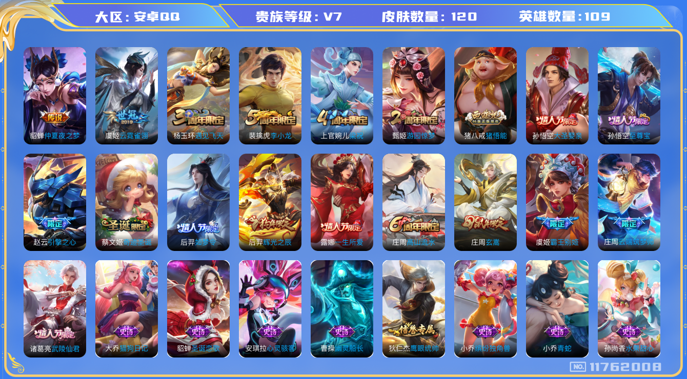 [11762008]V7 3传说 109英雄 120皮肤 可修改实名 优质装备:云霓雀翎,仲夏夜之梦(大飞蛾) 珍宝阁皮:蔷薇恋人 限定皮:至尊宝,武陵仙君(小桃花),玄嵩(庄周年限),遇见飞天,高山流水,游园惊梦,梁祝,李小龙,辉光之辰,如梦令-后羿,霸王别姬-虞姬,奇迹圣诞,猪悟能,一生所爱,大圣娶亲,引擎之心,云端筑梦师 史诗皮:遇见神鹿,黄金分割率,青蛇,猫狗日记-大乔,水果甜心,心灵骇客,幽灵船长,舞动绿茵,纤云弄巧,繁星吟游(呼啦呼啦),缤纷独角兽,圣诞恋歌,鹰眼统帅,魅力维加斯