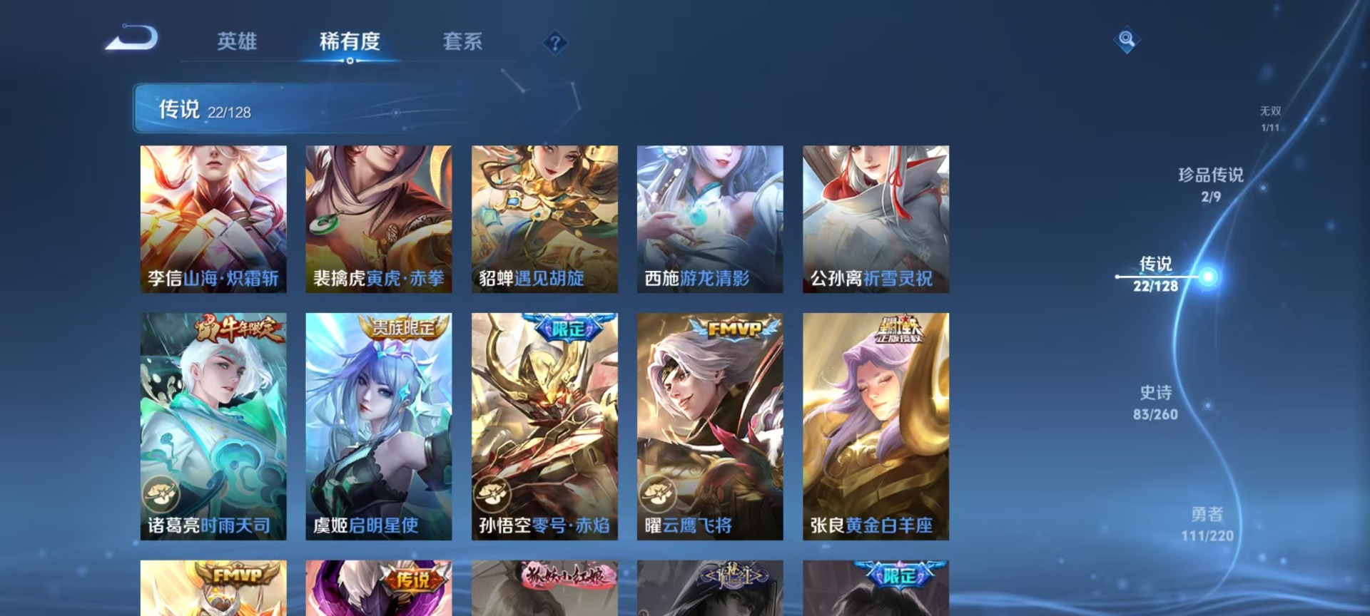 - [11796231]V8 1典藏 1珍品传说 32传说 124英雄 262皮肤 可修改实名 优质装备:鸣剑·曳影,江户川柯南,黄金狮子座,绛天战甲(鸡嘴战神),地狱之眼,飞鸢探春,时之恋人-刘备(电焊工),山海·炽霜斩(李信年限),炽翼辉光(娃娃菜牛角包),燃星之曲,澜逐花归海,琥珀纪元铠,琥珀纪元马超,牧神诗旅,玄雷天君 传说皮:乘龙·问璇玑(孙尚香年限),乘龙·铭钟鼎(赵云年限),乘龙·淬吴钩(孙策年限),貂蝉曦玄引,吕布曦玄引,典韦战鼓燎原,落雪白狼,幻光神枪 珍宝阁皮:胡桃夹子 限定皮:愿照·岁时盈(虞姬年限),愿照·众生和(妲己年限),逐霄战戟,鸣野蒿,夏侯惇霜北刀,补天,白晶晶,时雨天司(水龙头),齐天大圣,五谷丰年,武圣,梁祝,御风骁将(吕布年限),龙胆,逐梦之翼,烈魂,岱宗(典韦年限),虎魄,奔雷神使(牛魔年限),永曜之星,如梦令-嫦娥,如梦令-后羿,引擎之心,寅虎·心曲(虎婆),寅虎·赤拳(老虎年限),玉兔公主,山海·玄木吟(马可年限) 史诗皮:器灵·浮梦炉,星界战将,谪仙醉月,茶境仙,怒海争锋,撼地雄心,破空之剑,战舞者,琥珀纪元伽罗,曹操夜都魔契,超元猎域,乘龙·聚宝船(安琪拉年限),乘龙·忆丹青(大乔年限),百相守梦-百里守约,紫霞仙子,江河有灵,匿光侦查者,末日机甲-莱西奥,百解令(蒙犽),高渐离燃音魔法,蒙恬荣光圣徽,匿光破解者,冰冠公主,偶像歌手,晚萤,电玩·爆裂旋风,百相守梦(刘备),暗夜猫娘,末日机甲-吕布,猫狗日记-孙策,乱世虎臣,节奏热浪,女仆咖啡,摇滚巨星,水果甜心,绅士熊喵,天才门将,星夜王子,德古拉伯爵,暗隐猎兽者,鬼剑武藏,暗渊魔法,心灵战警,乐园奇幻夜,纤云弄巧,拒霜思,缤纷独角兽,乘风破浪,龙鼓争鸣,月团寄思,水晶猎龙者,曙光守护者,金属风暴,原初追逐者,鹰眼统帅,魅力维加斯,滕王阁序,顽趣-阿古朵,无心