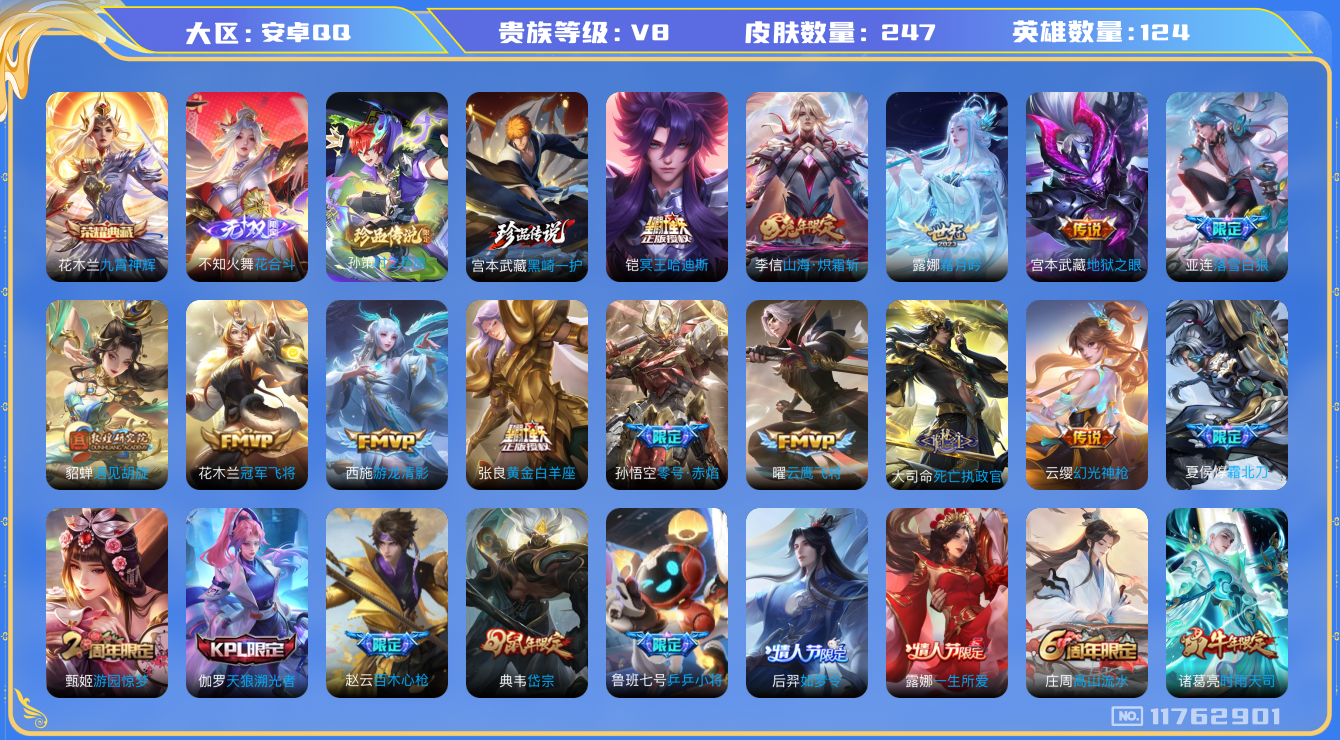 [11762901]V8 1典藏 1无双 2珍品传说 22传说 124英雄 247皮肤 可修改实名 优质装备:九霄神辉(木兰典藏),花合斗,黑崎一护,冠军飞将,云鹰飞将(小将军),黄金白羊座,零号·赤焰,地狱之眼,游龙清影(小青龙),遇见胡旋,山海·炽霜斩(李信年限),霜月吟,涂山容容 珍品传说:时之奇旅-孙策 传说皮:落雪白狼,死亡执政官,铠冥王哈迪斯,幻光神枪 珍宝阁皮:女武神,玩趣恶龙 限定皮:愿照·岁时盈(虞姬年限),愿照·千秋盛(女娲年限),鸣野蒿,夏侯惇霜北刀,傲雪梅枪,魔法小厨娘,时雨天司(水龙头),高山流水,无限倾心-虞姬,五谷丰年,游园惊梦,梁祝,逐梦之星,岱宗(典韦年限),天狼溯光者,祈雪灵祝(雪兔子),如梦令-后羿,默契交锋-花木兰,一生所爱,大圣娶亲,乒乒小将,寅虎·赤拳(老虎年限),百木心枪 史诗皮:赞萌露比,化蝶舞,星界战将,龙之律动,石田雨龙,茶境仙,东方月初,蒙犽顽岩魄,埋骨钱,芈月浮光幕影,决胜骁骑,织梦人,守夜人,紫霞仙子,黄金分割率,特工魅影,千年之狐,匿光侦查者,魅语,百解令(蒙犽),匿光破解者,冰冠公主,偶像歌手,晚萤,末日机甲-吕布,猫狗日记-孙策,猫狗日记-大乔,时之恋人-孙尚香,乱世虎臣,节奏热浪,修罗,女仆咖啡,水果甜心,星夜王子,心灵骇客,功夫厨神,德古拉伯爵,暗隐猎兽者,幽灵船长,鬼剑武藏,心灵战警,天秀·启明,地狱岩魂,纤云弄巧,拒霜思,缤纷独角兽,乘风破浪,逐浪之夏,曙光守护者,金属风暴,圣诞狂欢,圣诞恋歌,鹰眼统帅,魅力维加斯,赏金猎手,无心,未来纪元-赵云