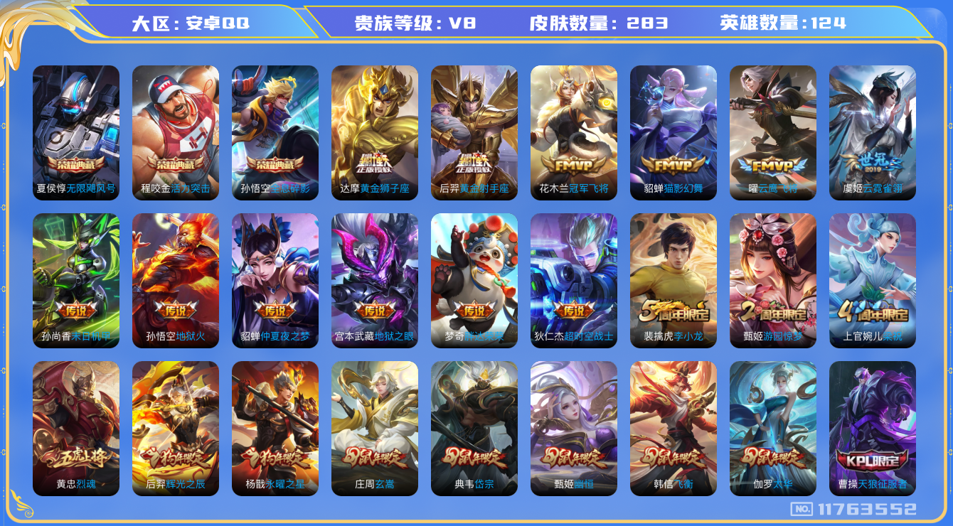 [11763552]【商品标题】:安卓Q-V0-尊贵铂金II段位-124英雄-283皮肤-3典藏-0珍品无双-0无双-0珍品传说-19传说-93史诗