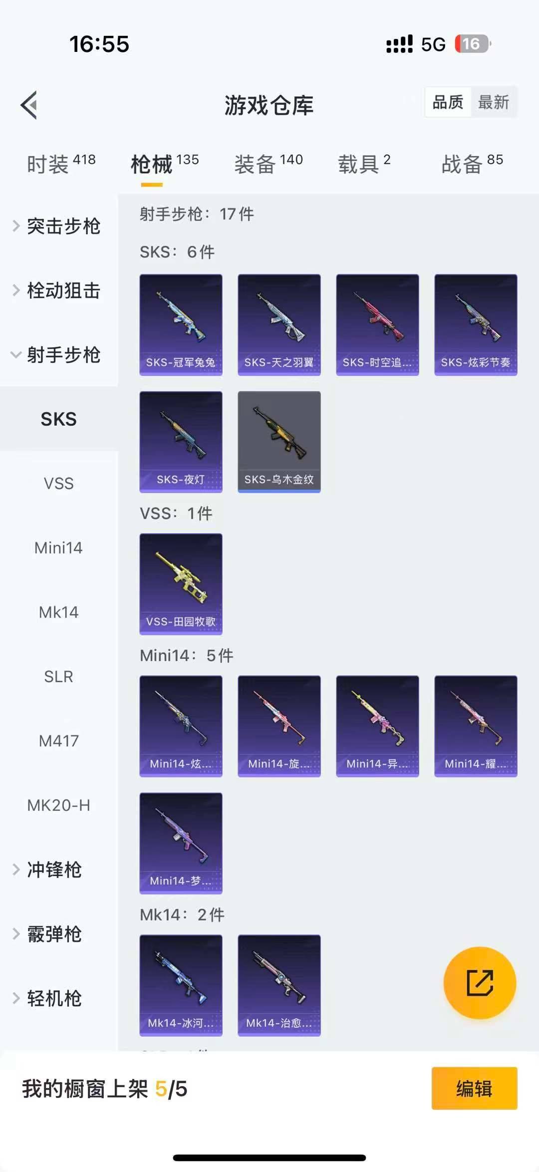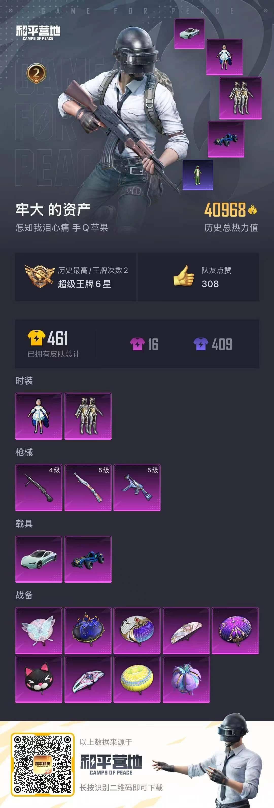 - PX_2094700- 安卓手Q-2王牌印记-2粉装-4特效枪-1载具-17356热力值-46套装-58枪皮-0卓越印记-0传奇印记 【2粉装】,幻彩电音,呆萌星弥 【4特效枪】GROZA-镜光银凌-5级 AUG-暖羊咩咩-5级 Kar98K-巳巳如意-5级 MK12-雪月幻音-4级 【1稀有紫装】,暗影哥特, 【1稀有载具】,宝马M4(圣保罗黄), 【46稀有时装】,荧光绘影,SS31特训,S