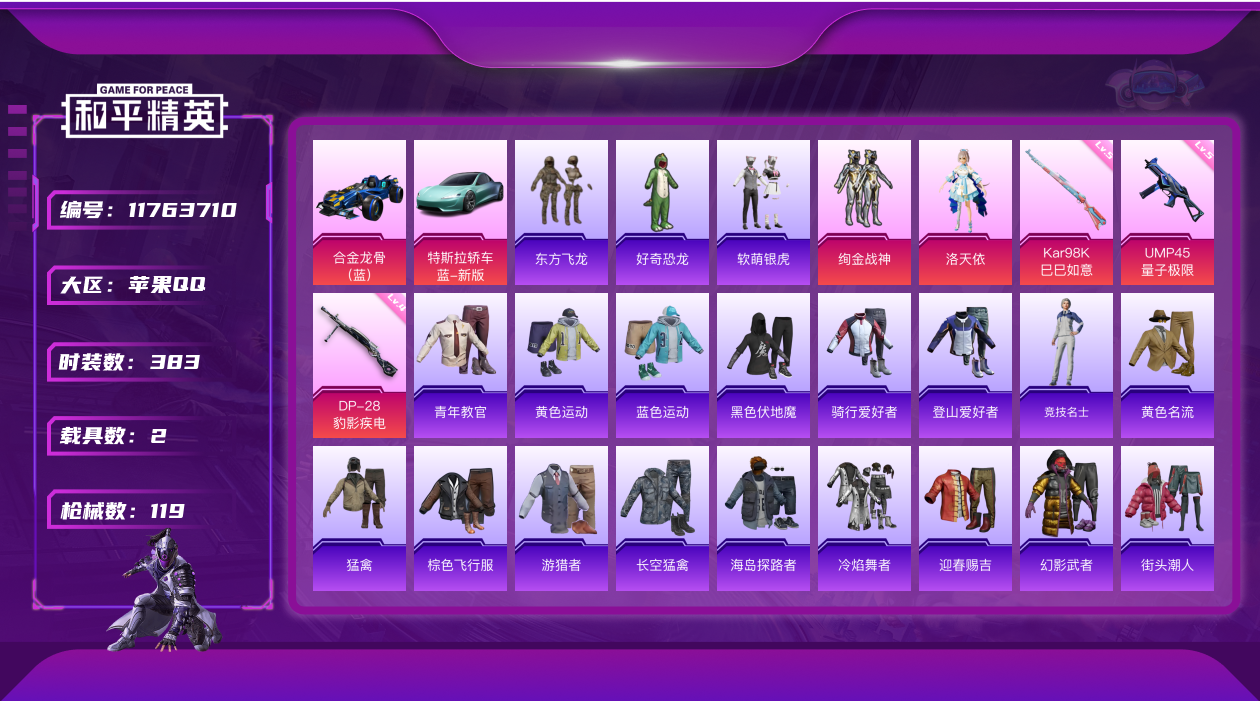 [11763710]2粉装 3特效枪 2载具 2印记 可二次 可修改实名 优质装备:合金龙骨(蓝),特斯拉Roadster(水滴蓝),绚金战神,洛天依,UMP45量子极限,Kar98K-巳巳如意 热门装扮:软萌银虎,东方飞龙,好奇恐龙 稀有枪皮:DP-28-豹影疾电 五级特效枪:五级UMP45-量子极限,五级Kar98K-巳巳如意 四级特效枪:四级DP-28-豹影疾电 紫色装扮:田园牧歌,轻风白浪,SS22特训,照水倚天,娇憨猪猪,萌趣咩咩,SS21特训,SS31特训套装,冰川特警,冷焰舞者,千禧之恋,SS33特训套装,顶瓜瓜,SS15特训,时空追击者,暴风机械师,SS16特训,冰爽风暴,爆裂葡萄,冰爽海盐,SS13特训,击剑大师,诡谋托雷基亚,治愈之星,迅捷之星,科技之星,SS14特训,萌趣颜团子,SS19特训,SS17特训,异彩先驱,SS18特训,都市漫游者,都市魅力,酷萌兔限定,长空猛禽,霓虹极客,霓虹街区,青年教官,迎春赐吉,缤纷果语,蓝彩潮人,蓝色运动,街头潮人,骑行爱好者,魅力单车,鹤鸣,麻辣教官,黄色名流,黄色运动,黑色伏地魔,龙魂突击队,棕色飞行服,海岛探路者,清新柠檬,幻影武者,夏日音浪,幻世战舞者,登山爱好者,白熊同盟,破晓战魂,破蛋小黄鸡,游猎者,空投萌叽,竞技达人朋克,猛禽,达芬奇,纯真浪花,热情海星,SS28特训,卖崽青蛙,冰公主,鱼渊荷华,燕燕于飞,巳巳如意,竞技名士,焰鹰斗篷,幻羽潜行,SS27特训,智谋强哥,晶辉守护,薄荷蓝莓,SS11特训,耀粉歌者,SS32特训服(SS32特训套装),萌黄之夏,海上生明月 优质战备:精灵梦叶罗丽降落伞,星空武士降落伞,晶梦幻蝶降落伞,鬼刀降落伞,神秘黑猫降落伞,荧光虫舞降落伞,香水柠檬降落伞,梦之光华降落伞,暗星紫秘降落伞