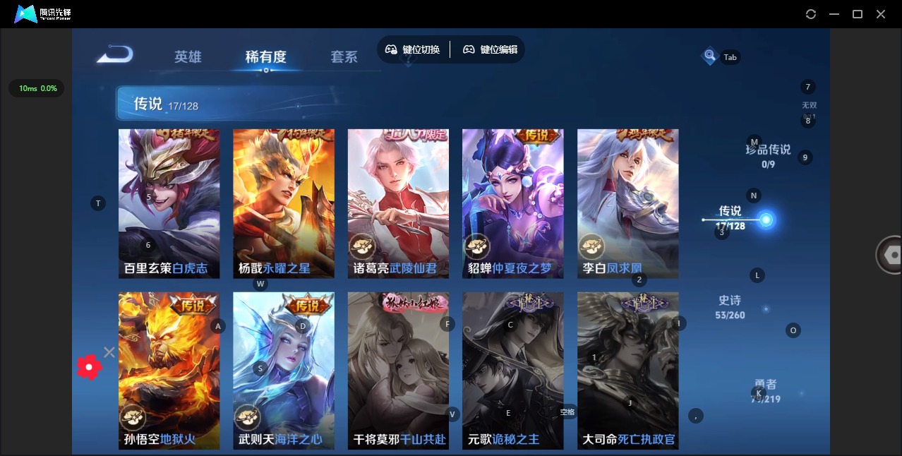 - PX_2104973-Q/最强王者/319皮肤/126英雄/2典藏/0珍品无双/0无双/0珍品传说/34传说/89史诗/10稀有英雄 【2 典藏皮肤】全息碎影 孙悟空,无限飓风号 夏侯惇, 【34 传说皮肤】胖达荣荣 梦奇,武圣 关羽,启明星使 虞姬,云霓雀翎 虞姬,逐花归海 澜,飞鸢探春 李元芳,白虎志 百里玄策,零号·赤焰 孙悟空,地狱火 孙悟空,云鹰飞将 曜,补天 女娲,觅芳踪 艾琳,猫影幻
