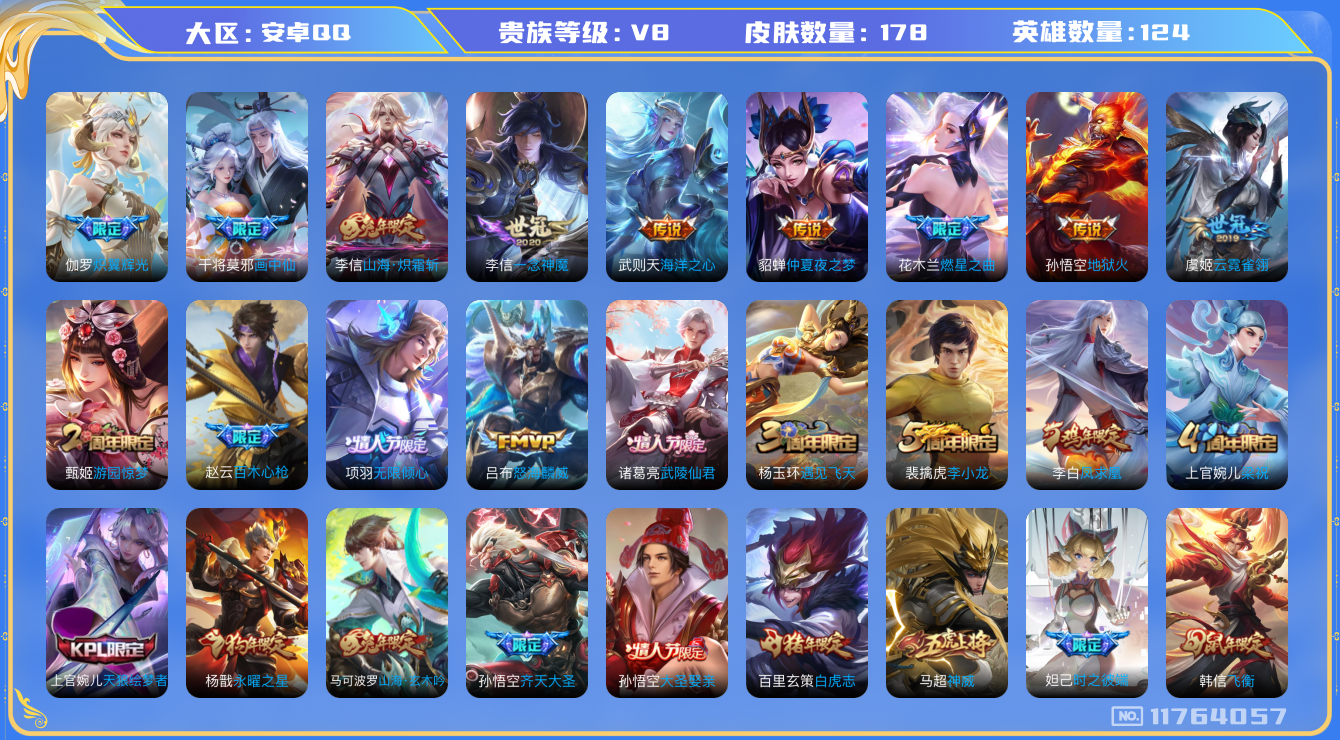 [11764057]V8 17传说 124英雄 178皮肤 典藏英雄武则天 可修改实名 优质装备:一念神魔,云霓雀翎,地狱火,仲夏夜之梦(大飞蛾),海洋之心,山海·炽霜斩(李信年限),炽翼辉光(娃娃菜牛角包),燃星之曲,画中仙 珍宝阁皮:优雅恋人 限定皮:白虎志(电光耗子),凤求凰(白切鸡),武陵仙君(小桃花),时之彼端,神威(电光马子),飞衡(韩信年限),无限倾心-项羽,遇见飞天,齐天大圣,怒海麟威,冰锋战神,游园惊梦,梁祝,天狼绘梦者,李小龙,朱雀志(守约年限),永曜之星,大圣娶亲,百木心枪,山海·玄木吟(马可年限) 史诗皮:黄金分割率,千年之狐,江河有灵,魅语,冰冠公主,偶像歌手,猫狗日记-孙策,猫狗日记-大乔,时之恋人-孙尚香,乱世虎臣,修罗,天才门将,星夜王子,时之奇旅-安琪拉,德古拉伯爵,暗隐猎兽者,幽灵船长,暗渊魔法,心灵战警,舞动绿茵,地狱岩魂,纤云弄巧,繁星吟游(呼啦呼啦),乘风破浪,逐浪之夏,曙光守护者,圣诞狂欢,鹰眼统帅,魅力维加斯