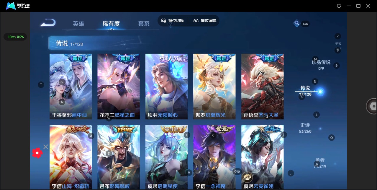 - [11528965]V6 3传说 123英雄 161皮肤 可修改实名 传说皮:幻光神枪 珍宝阁皮:蔷薇恋人 限定皮:愿照·九州拓(澜年限),愿照·岁时盈(虞姬年限),遇见飞天,游园惊梦,梁祝,李小龙,逐梦之影 史诗皮:化蝶舞,龙之律动,雪豹·霜爪,茶境仙,紫霞仙子,末日机甲-吕布,节奏热浪,水果甜心,暗隐猎兽者,诗语江南,纤云弄巧,繁星吟游(呼啦呼啦),缤纷独角兽,乘风破浪,逐浪之夏,曙光守护者,原初追逐者,鹰眼统帅,魅力维加斯