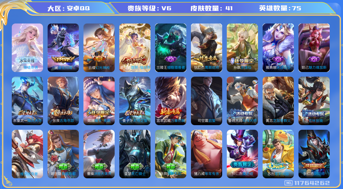 [11764262]V6 1无双 3传说 75英雄 41皮肤 可修改实名 优质装备:雪境奇遇-甄姬,澜逐花归海 传说皮:幻光神枪 限定皮:愿照·福禄聚(蔡文姬年限) 史诗皮:茶境仙,冰冠公主,暗隐猎兽者,鹰眼统帅,魅力维加斯