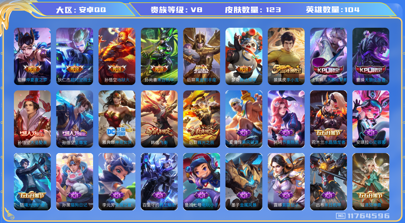 - [12029061]V7 12传说 123英雄 154皮肤 可修改实名 优质装备:云鹰飞将(小将军),绛天战甲(鸡嘴战神),挚爱之约,山海·炽霜斩(李信年限),山海·苍雷引(电光曜子),黄金天蝎座,涂山容容 传说皮:吕布曦玄引,铠冥王哈迪斯 珍宝阁皮:万物之道,蔷薇恋人 限定皮:愿照·九州拓(澜年限),逐霄战戟,鸣野蒿,夏侯惇霜北刀,高山流水,齐天大圣,五谷丰年,岱宗(典韦年限),孙行者,猪悟能 史诗皮:苍鳞隐世,绮世丹青,化蝶舞,谪仙醉月,龙之律动,怒海争锋,东方月初,蒙犽顽岩魄,海诺心动手记,蔬乡物语(鲁班七号),苍穹之光,电玩小子(小书包),永昼,冰冠公主,猫狗日记-孙策,时之恋人-孙尚香,乱世虎臣,节奏热浪,水果甜心,心灵骇客,功夫厨神,暗隐猎兽者,鬼剑武藏,心灵战警,地狱岩魂,金属风暴,鹰眼统帅,魅力维加斯,无心,未来纪元-赵云