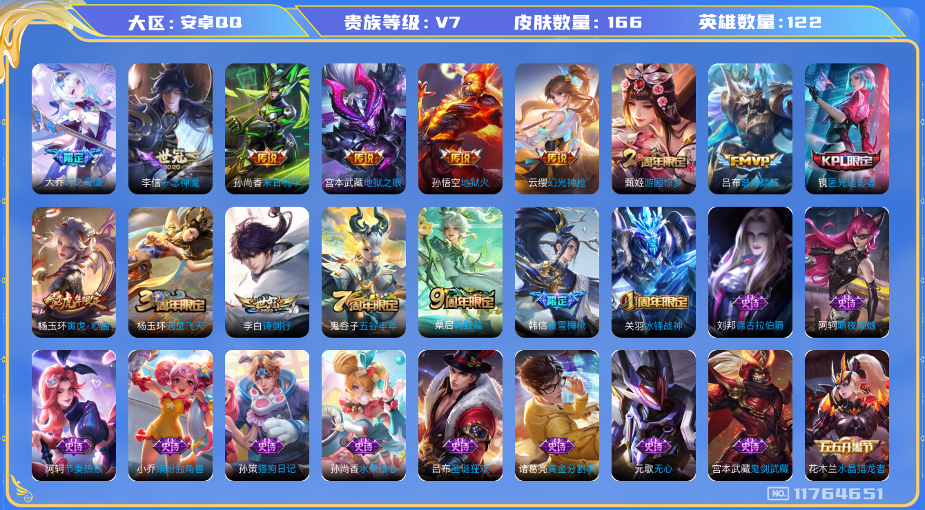 - [11883938]V7 1典藏 1珍品传说 12传说 123英雄 182皮肤 可修改实名 优质装备:鸣剑·曳影,怪盗基德,云鹰飞将(小将军),末日机甲-孙尚香(绿蚂蚱),超时空战士-狄仁杰,记忆之芯(机甲兔),鹤羽星尊,霜月吟 传说皮:貂蝉曦玄引,幻光神枪 珍宝阁皮:妄想食味 限定皮:愿照·千秋盛(女娲年限),鸣野蒿,补天,前尘镜,梁祝,李小龙,大圣娶亲 史诗皮:赞萌露比,器灵·浮梦炉,化蝶舞,星界战将,谪仙醉月,龙之律动,战舞者,蒙犽顽岩魄,琥珀纪元伽罗,百相守梦-百里守约,星界特工,百相守梦-黄忠,守夜人,电玩小子(小书包),特工魅影,永昼,冰冠公主,偶像歌手,晚萤,暗夜猫娘,龙骑士(小龙虾),节奏热浪,摇滚巨星,水果甜心,天才门将,心灵骇客,德古拉伯爵,暗隐猎兽者,鬼剑武藏,暗渊魔法,心灵战警,舞动绿茵,纤云弄巧,缤纷独角兽,逐浪之夏,月团寄思,水晶猎龙者,金属风暴,原初追逐者,圣诞狂欢,圣诞恋歌,鹰眼统帅,魅力维加斯,黎明之约,赏金猎手