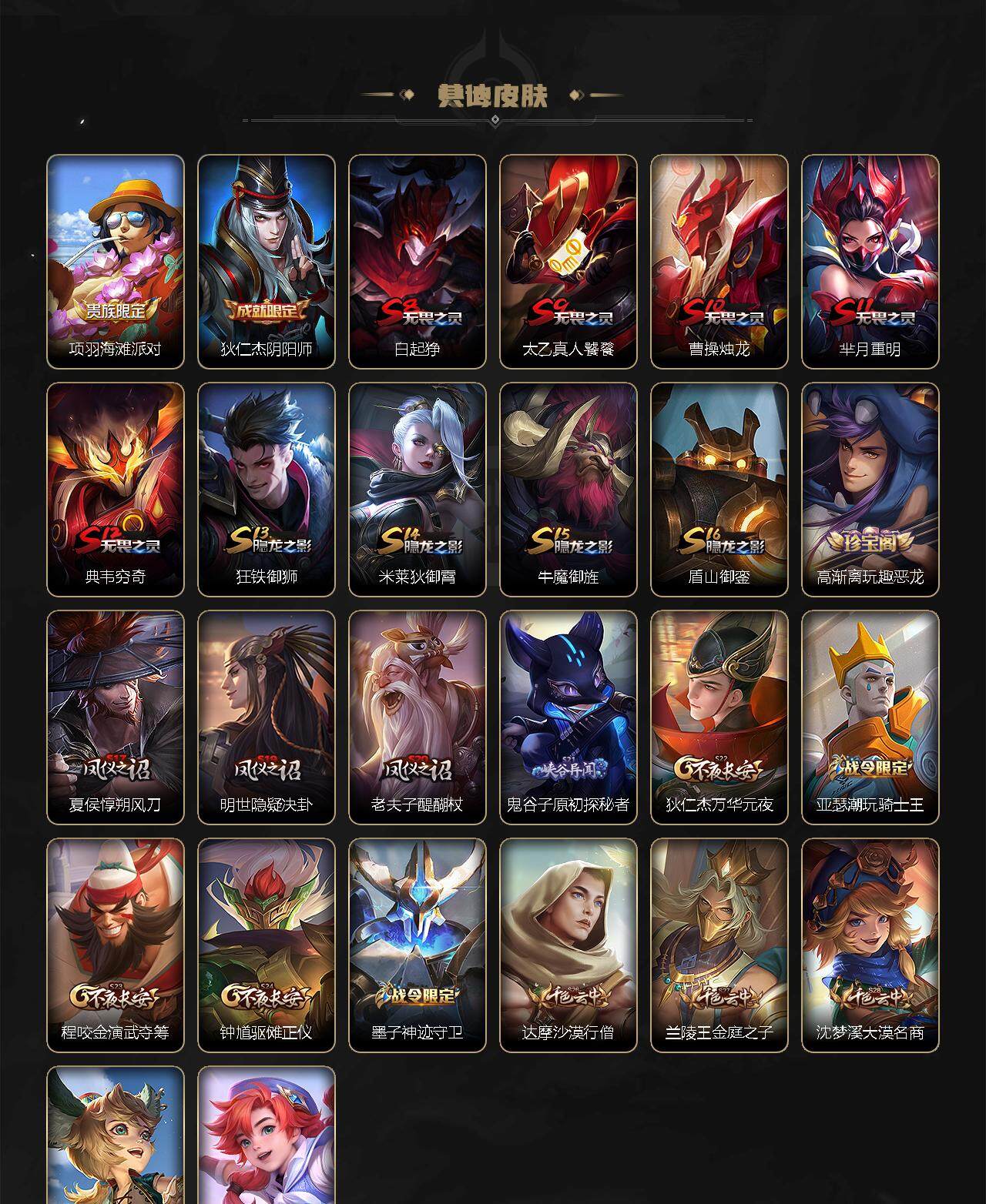 【赛季限定】:白起狰,芈月重明,夏侯惇朔风刀,曹操烛龙,典韦穷奇,狄仁杰万华元夜,达摩沙漠行僧,老夫子醍醐杖,程咬金演武夺筹,兰陵王金庭之子,张良古海寻踪,牛魔御旌,李元芳云中旅人,钟馗驱傩正仪,太乙真人饕餮,鬼谷子原初探秘者,梦奇顽趣,沈梦溪大漠名商,明世隐疑决卦,裴擒虎擒涛扼浪,狂铁御狮,米莱狄御霄,盾山御銮,鲁班大师探海日志,桑启海盐诗旅,鬼谷子天穹祈灯,刘邦剑破天穹