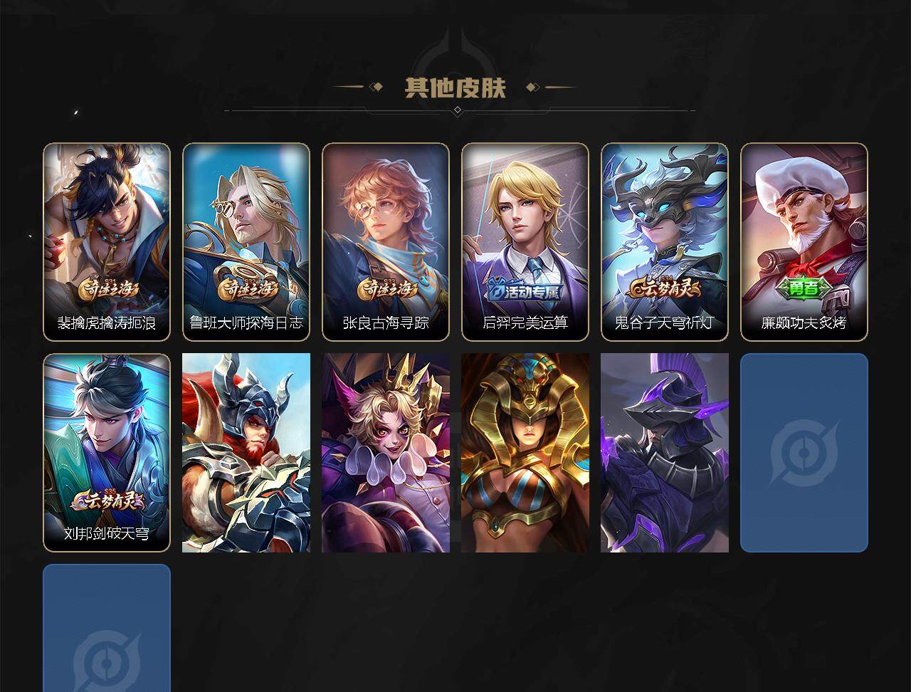 【其他皮肤】:项羽海滩派对,韩信教廷特使,韩信街头霸王,露娜哥特玫瑰,达摩大发明家,赵云忍炎影,白起白色死神,扁鹊化身博士,宫本武藏未来纪元,姜子牙时尚教父,妲己少女阿狸,典韦黄