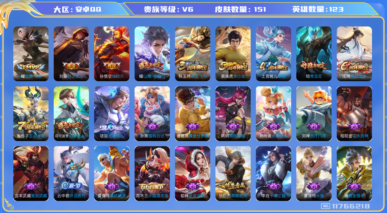 [11766218]【商品标题】:安卓Q-V6-荣耀黄金II段位-123英雄-151皮肤-0典藏-0珍品无双-0无双-0珍品传说-5传说-28史诗