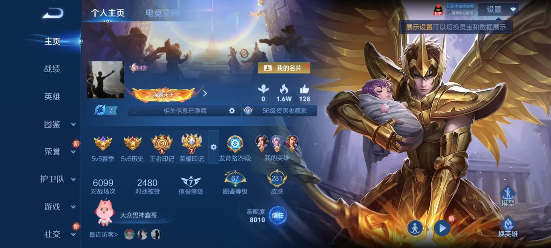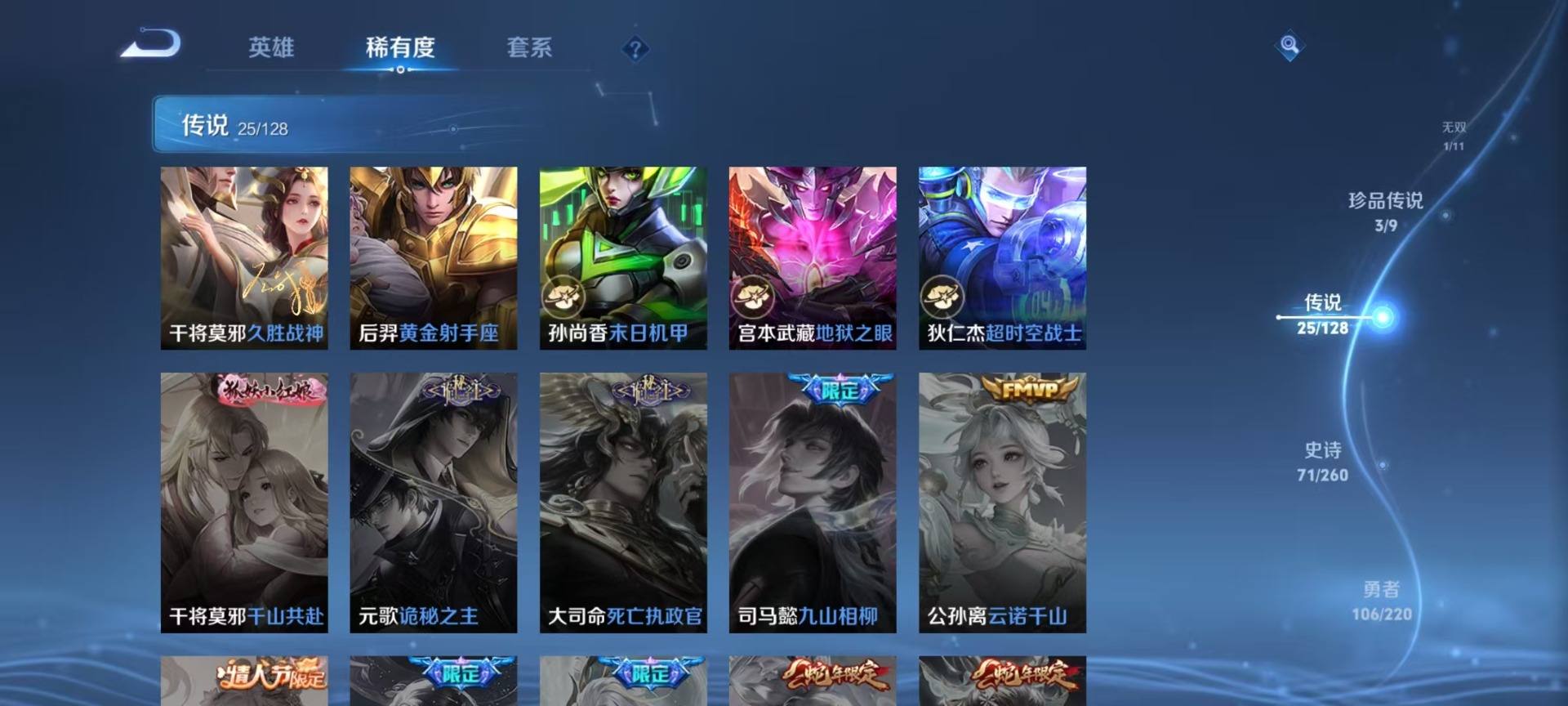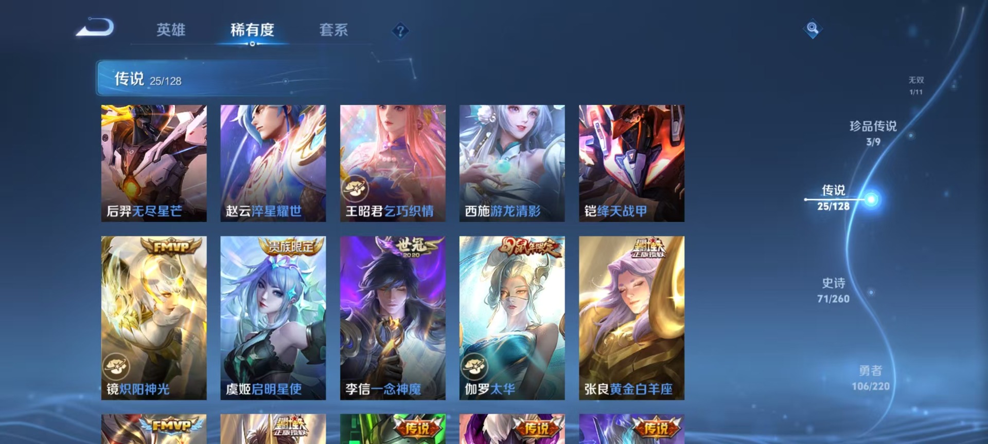- [12205038]V8 3典藏 11传说 124英雄 343皮肤 可修改实名 优质装备:鸣剑·曳影,全息碎影(猴子典藏),最初的交响(伽罗典藏),云鹰飞将(小将军),一念神魔,仲夏夜之梦(大飞蛾),地狱之眼,淬星耀世,无双飞将 珍宝阁皮:女武神,玩趣恶龙 限定皮:鸣野蒿,至尊宝,凤凰于飞,太华(伽罗年限),白晶晶,时雨天司(水龙头),遇见飞天,匿光决锋者,五谷丰年,冰锋战神,游园惊梦,梁祝,御风骁将(吕布年限),祈雪灵祝(雪兔子),李小龙,霸王别姬-虞姬,圣诞老人,默契交锋-花木兰,孙行者,大圣娶亲,冰霜恋舞曲 史诗皮:赞萌露比,龙之律动,石田雨龙,百相守梦-周瑜,怒海争锋,蔬乡物语(鲁班七号),百相守梦-百里守约,紫霞仙子,电玩小子(小书包),白龙吟,黄金分割率,特工魅影,千年之狐,雪夜绮愿(周瑜),魅语,百解令(蒙犽),高渐离燃音魔法,冰冠公主,偶像歌手,晚萤,末日机甲-吕布,猫狗日记-孙策,猫狗日记-大乔,时之恋人-孙尚香,乱世虎臣,节奏热浪,修罗,女仆咖啡,摇滚巨星,水果甜心,绅士熊喵,星夜王子,心灵骇客,功夫厨神,德古拉伯爵,暗隐猎兽者,鬼剑武藏,心灵战警,天秀·启明,舞动绿茵,地狱岩魂,诗语江南,纤云弄巧,繁星吟游(呼啦呼啦),拒霜思,缤纷独角兽,乘风破浪,逐浪之夏,水晶猎龙者,曙光守护者,箭羽风息,金属风暴,原初追逐者,圣诞狂欢,圣诞恋歌,鹰眼统帅,暗夜贵公子,魅力维加斯,黎明之约,赏金猎手,无心,未来纪元-赵云