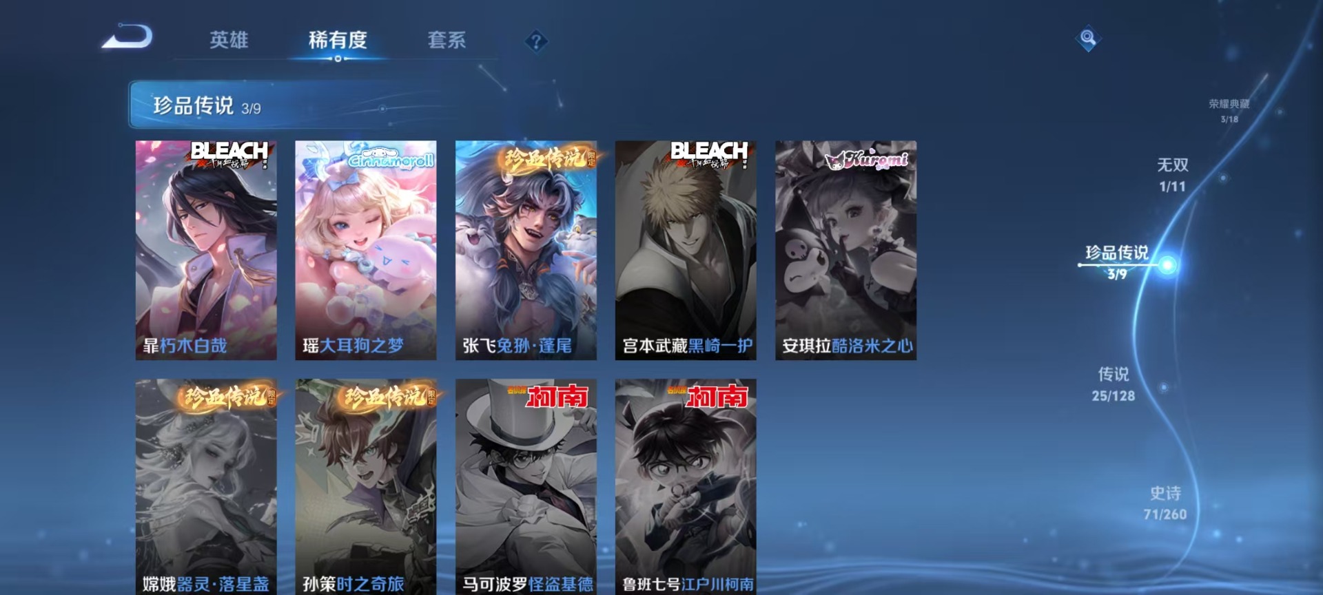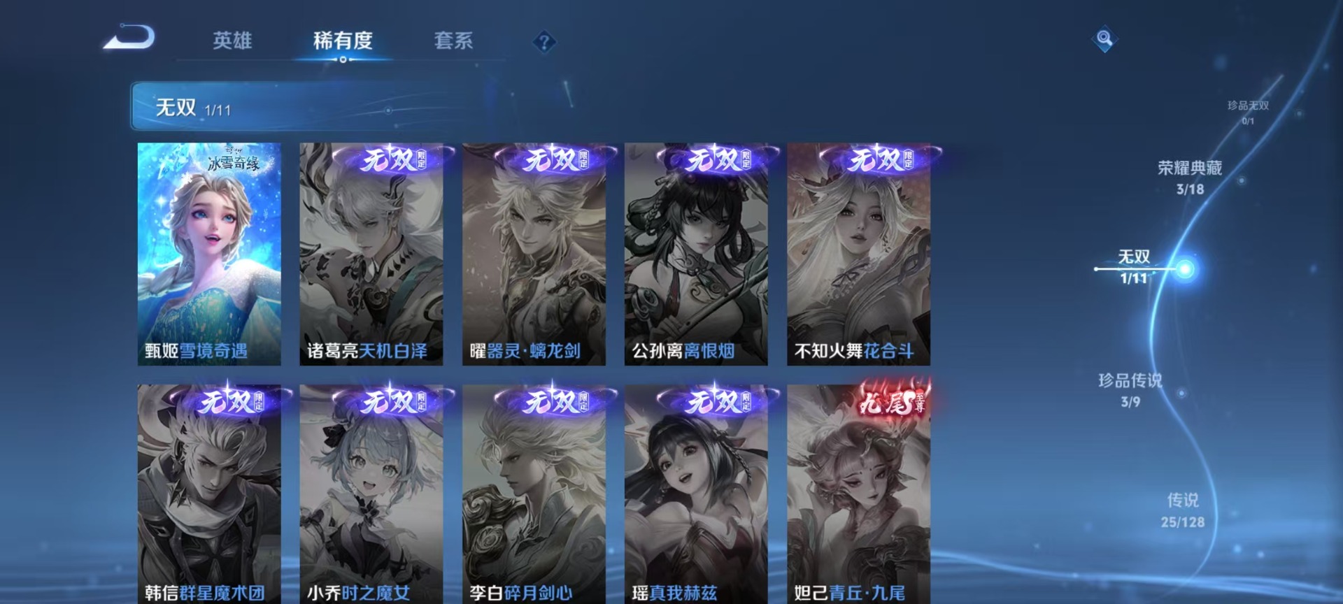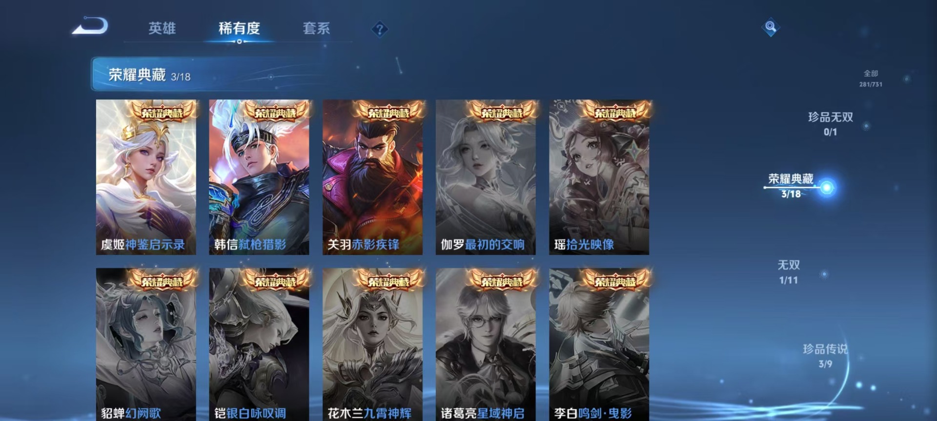 大乔白鹤梁神女,金蝉唐三藏,甄姬女儿国国王,伽罗太华,后羿无尽星芒,后羿如梦令,后羿辉光之辰,杨玉环寅虎·心曲,公孙离玉兔公主,司空震愿照·山河定,马可波罗山海·玄木吟,桑启鸣野蒿,孙悟空孙行者,孙悟空至尊宝,澜愿照·九州拓,虞姬愿照·岁时盈