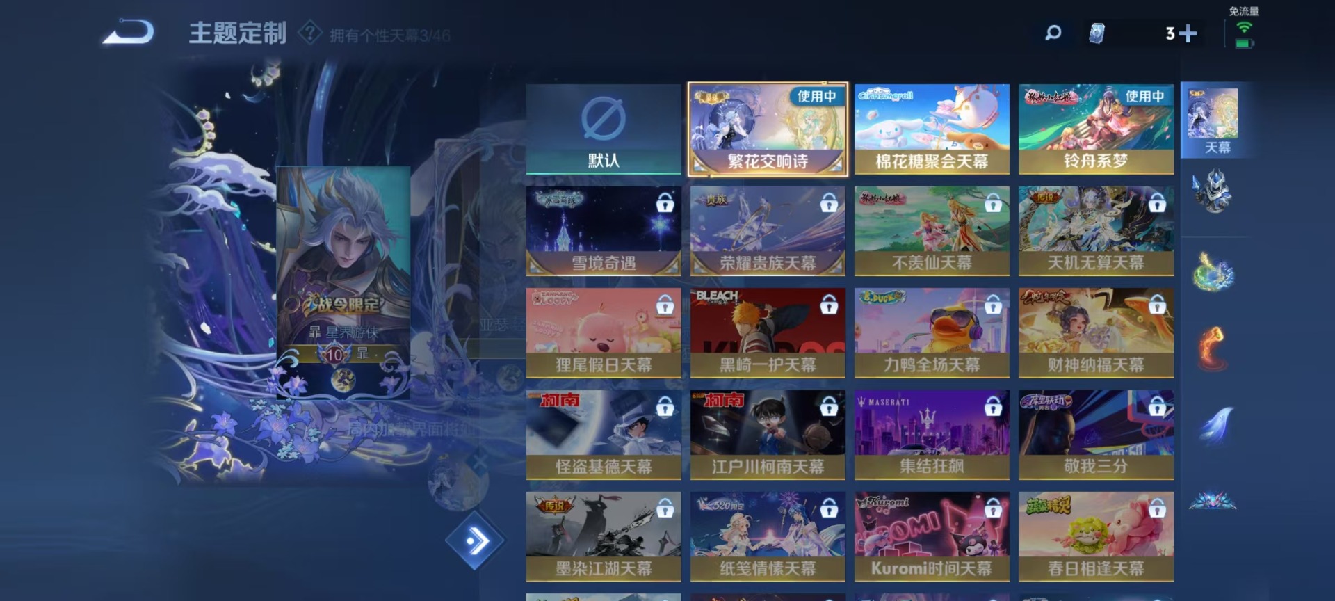 刘邦德古拉伯爵,阿轲节奏热浪,廉颇地狱岩魂,小乔缤纷独角兽,孙尚香时之恋人,孙策猫狗日记,不知火舞魅语,赵怀真器灵·浮梦炉,吕布末日机甲,露娜紫霞仙子,诸葛亮黄金分割率,刘禅天才门将,宫本武藏鬼剑武藏,李白谪仙醉月,苍狼魂孤将,上官婉儿群星魔术团,明世隐夜落电台,艾琳奇遇舞章,西施诗语江南,亚瑟心灵战警,嬴政摇滚巨星,嬴政暗夜贵公子,莱西奥末日机甲,百里玄策原初追逐者,雅典娜冰冠公主,韩信白龙吟,李元芳逐浪之夏,百里守约特工魅影,墨子金属风暴,瑶遇见神鹿,王昭君偶像歌手,钟馗乐园奇幻夜