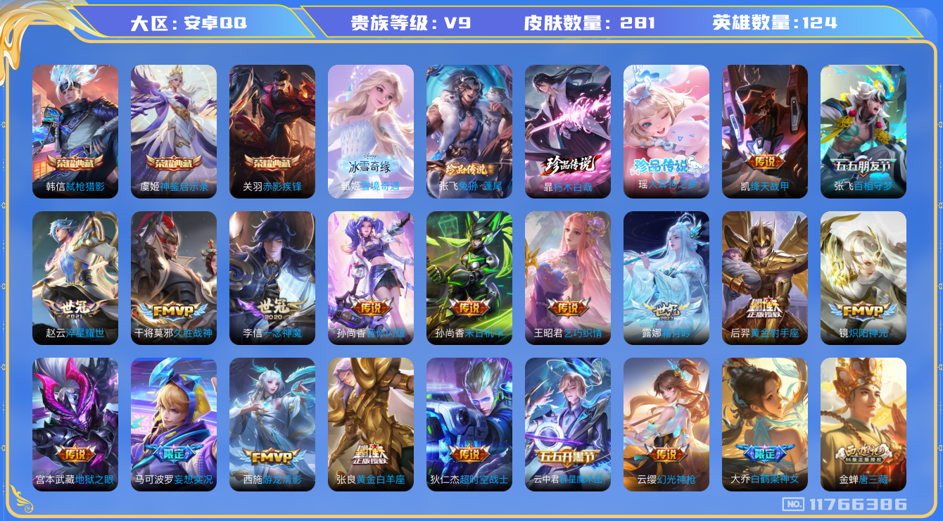 [11766386]V9 3典藏 1无双 3珍品传说 25传说 124英雄 281皮肤 可修改实名 优质装备:赤影疾锋,弑枪猎影(韩信典藏),神鉴启示录,雪境奇遇-甄姬,大耳狗之梦,朽木白哉,黄金射手座,绛天战甲(鸡嘴战神),黄金白羊座,久胜战神,炽阳神光,一念神魔,末日机甲-孙尚香(绿蚂蚱),地狱之眼,乞巧织情,游龙清影(小青龙),淬星耀世,超时空战士-狄仁杰,音你闪耀(rap皮),百相守梦(张飞),妄想实况,霜月吟,云中君群星魔术团 珍品传说:兔狲·蓬尾 传说皮:幻光神枪 珍宝阁皮:蔷薇恋人 限定皮:愿照·九州拓(澜年限),愿照·岁时盈(虞姬年限),愿照·山河定(司空震年限),鸣野蒿,至尊宝,太华(伽罗年限),白鹤梁神女,辉光之辰,如梦令-后羿,孙行者,女儿国国王,寅虎·心曲(虎婆),玉兔公主,无尽星芒,唐三藏,山海·玄木吟(马可年限) 史诗皮:赞萌露比,鸭鸭历险记-刘禅,器灵·浮梦炉,狼魂孤将,化蝶舞,星界战将,谪仙醉月,龙之律动,石田雨龙,百相守梦-周瑜,茶境仙,怒海争锋,破空之剑,涂山红红,东方月初,蒙犽顽岩魄,夜落电台,上官婉儿群星魔术团,蔬乡物语(鲁班七号),百相守梦-百里守约,星界特工,百相守梦-黄忠,织梦人,遇见神鹿,紫霞仙子,白龙吟,黄金分割率,特工魅影,末日机甲-莱西奥,魅语,冰冠公主,偶像歌手,末日机甲-吕布,猫狗日记-孙策,时之恋人-孙尚香,乱世虎臣,节奏热浪,女仆咖啡,摇滚巨星,水果甜心,天才门将,德古拉伯爵,鬼剑武藏,心灵战警,乐园奇幻夜,地狱岩魂,诗语江南,缤纷独角兽,逐浪之夏,金属风暴,原初追逐者,鹰眼统帅,暗夜贵公子,魅力维加斯,奇遇舞章,未来纪元-赵云