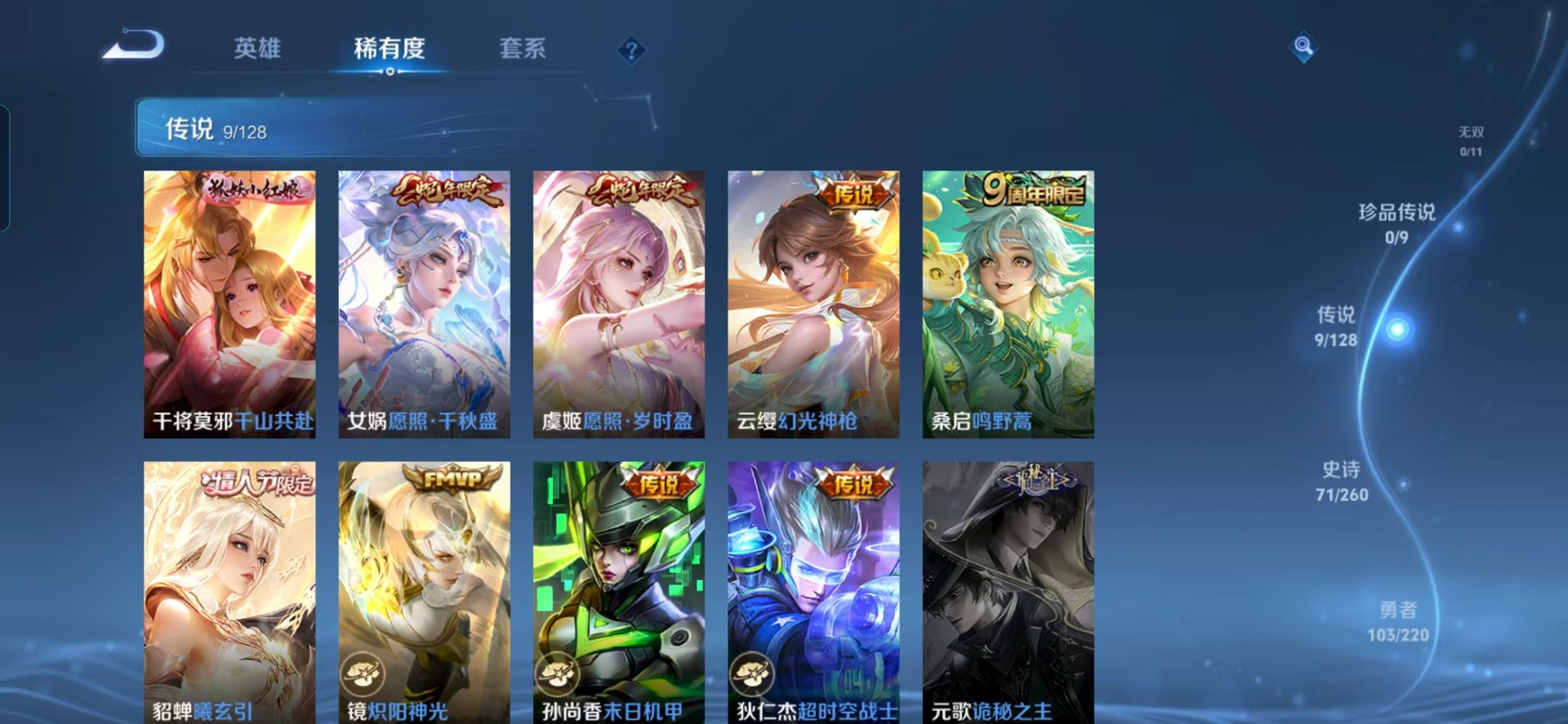 - [11602963]V6 4传说 124英雄 142皮肤 可修改实名 优质装备:炽阳神光,超时空战士-狄仁杰,黄金天蝎座 珍宝阁皮:妄想食味 限定皮:鸣野蒿,梁祝,御风骁将(吕布年限),李小龙,山海·玄木吟(马可年限) 史诗皮:东方月初,蒙犽顽岩魄,海诺心动手记,星界特工,黄金分割率,千年之狐,乱世虎臣,修罗,女仆咖啡,摇滚巨星,水果甜心,心灵骇客,德古拉伯爵,幽灵船长,鬼剑武藏,暗渊魔法,纤云弄巧,繁星吟游(呼啦呼啦),逐浪之夏,龙鼓争鸣,水晶猎龙者,金属风暴,鹰眼统帅,魅力维加斯,赏金猎手,未来纪元-赵云
