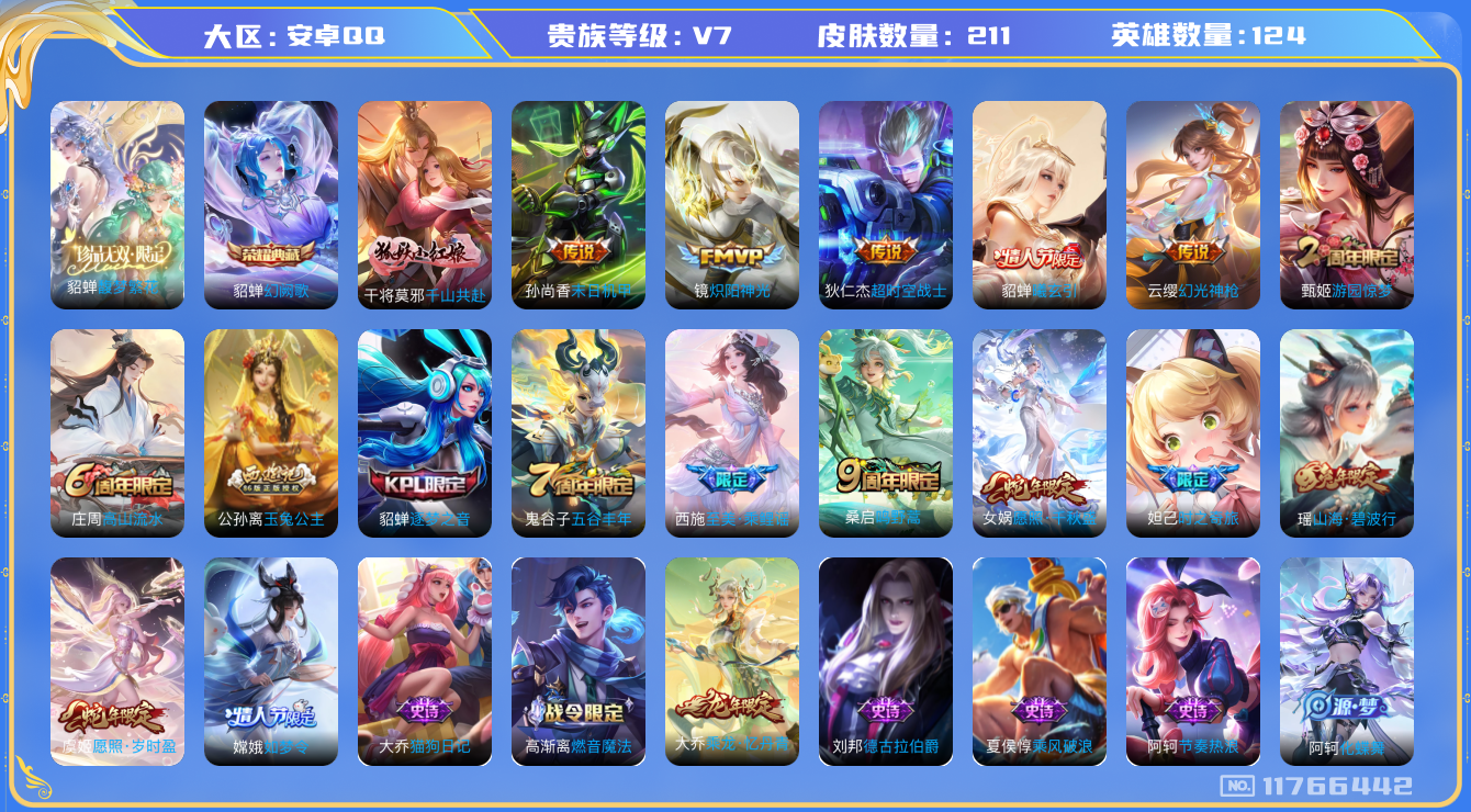 [11766442]V7 1典藏 1珍品无双 9传说 124英雄 211皮肤 可修改实名 优质装备:馥梦繁花,幻阙歌(貂蝉典藏),炽阳神光,末日机甲-孙尚香(绿蚂蚱),超时空战士-狄仁杰,千山共赴,涂山容容 传说皮:貂蝉曦玄引,幻光神枪 珍宝阁皮:妄想食味,蔷薇恋人,女武神 限定皮:愿照·岁时盈(虞姬年限),愿照·千秋盛(女娲年限),鸣野蒿,山海·碧波行(瑶年限),至美·乘鲤谣,高山流水,五谷丰年,游园惊梦,逐梦之音,如梦令-嫦娥,玉兔公主,时之奇旅-妲己 史诗皮:鸭鸭历险记-刘禅,器灵·浮梦炉,化蝶舞,龙之律动,幻珠鲛人,琥珀纪元伽罗,上官婉儿群星魔术团,蔬乡物语(鲁班七号),乘龙·聚宝船(安琪拉年限),乘龙·忆丹青(大乔年限),百相守梦-黄忠,织梦人,紫霞仙子,特工魅影,千年之狐,永昼,江河有灵,魅语,高渐离燃音魔法,蒙恬荣光圣徽,冰冠公主,青蛇,偶像歌手,晚萤,猫狗日记-孙策,猫狗日记-大乔,节奏热浪,女仆咖啡,摇滚巨星,水果甜心,心灵骇客,德古拉伯爵,暗隐猎兽者,鬼剑武藏,天秀·启明,舞动绿茵,纤云弄巧,繁星吟游(呼啦呼啦),拒霜思,缤纷独角兽,乘风破浪,逐浪之夏,水晶猎龙者,曙光守护者,箭羽风息,唤灵魅影,金属风暴,原初追逐者,圣诞狂欢,圣诞恋歌,鹰眼统帅,暗夜贵公子,魅力维加斯,黎明之约,未来纪元-赵云
