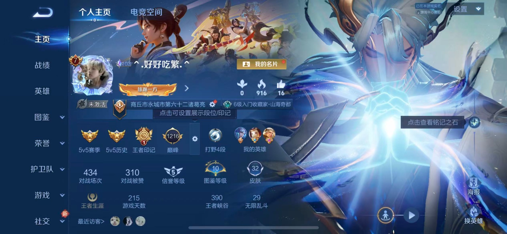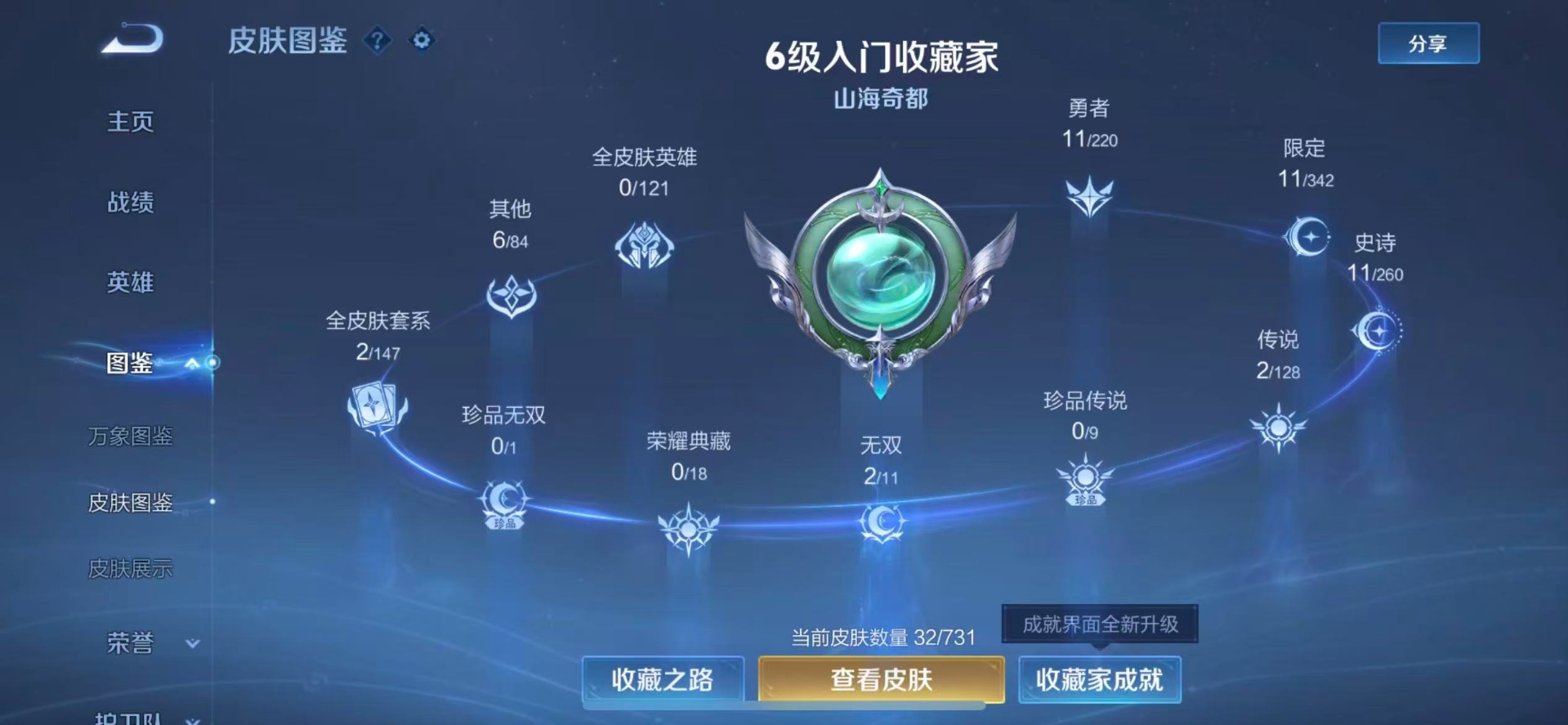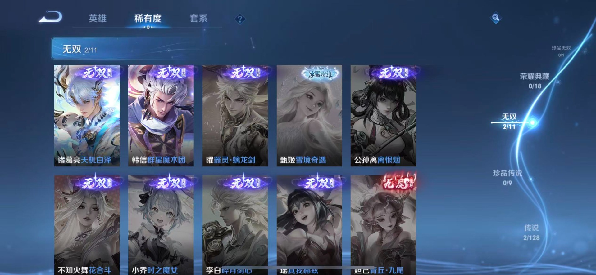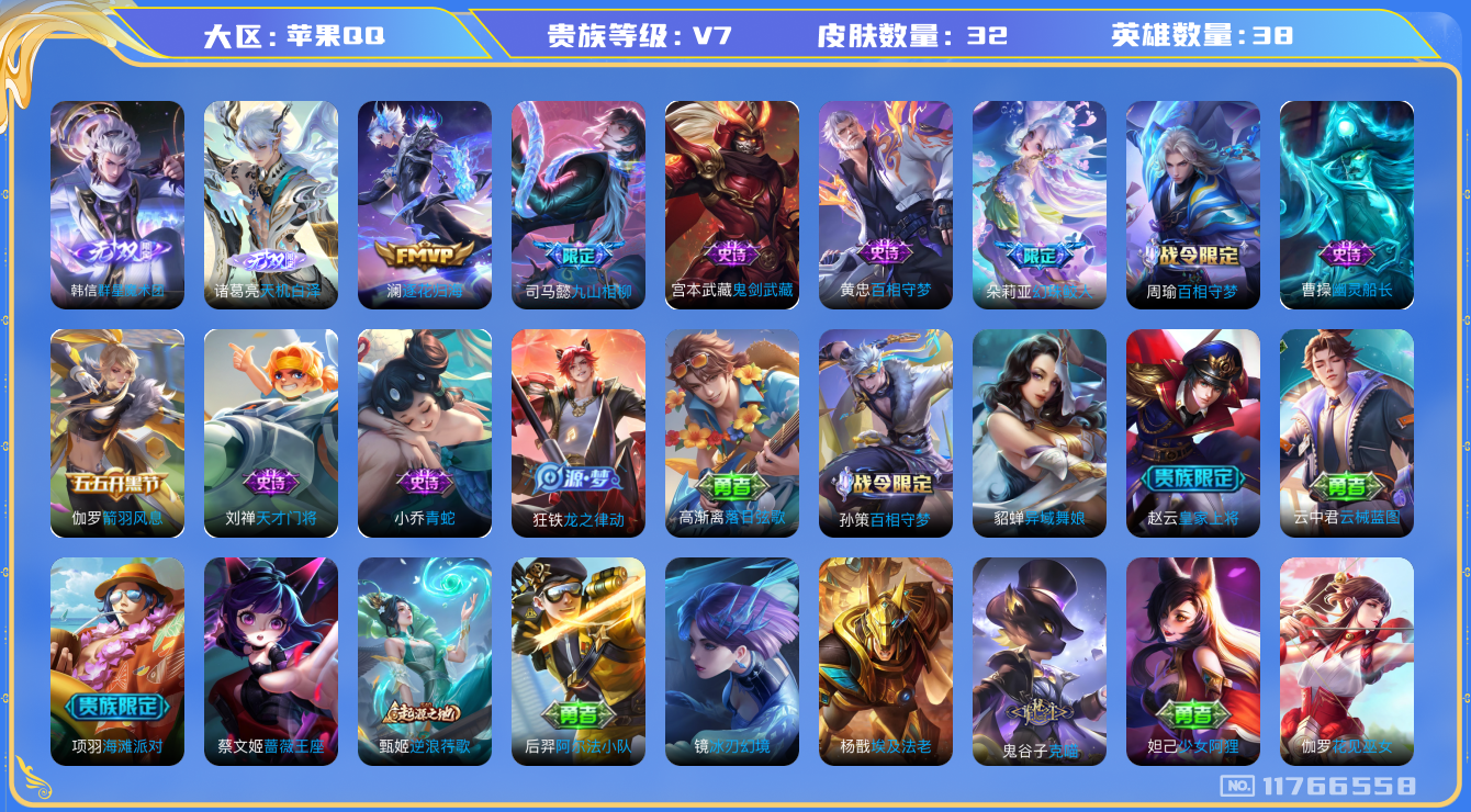 [11766558]V7 2无双 2传说 38英雄 32皮肤 可修改实名 优质装备:韩信群星魔术团(韩信无双),天机白泽,澜逐花归海 传说皮:九山相柳 史诗皮:龙之律动,百相守梦-周瑜,幻珠鲛人,百相守梦-黄忠,青蛇,天才门将,幽灵船长,鬼剑武藏,箭羽风息