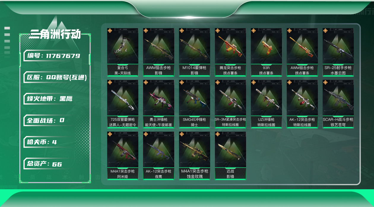 [11767679]总资产:66.2M 1近战传说 18传说枪械 哈夫币:4.080K 高级安全箱(2×3)9.15号到期 可二次 可修改实名 优质装备:近战-影锋 烽火地带段位:黑鹰 全面战场段位:上等兵 传说武器皮肤:SR-25射手步枪-水墨云图,M1014霰弹枪-影锋,AWM狙击步枪-影锋,SCAR-H战斗步枪-铁艺苍穹,SMG45冲锋枪-骑士,UZI冲锋枪-特斯拉线圈,AWM狙击步枪-捞点薯条,腾龙突击步枪-捞点薯条,93R-捞点薯条,AK-12突击步枪-特斯拉线圈,SR-3M紧凑突击步枪-特斯拉线圈,勇士冲锋枪-能天使-午夜邮差,复合弓-黑-天际线,725双管霰弹枪-送葬人-无题密令,M4A1突击步枪-阿米娅,AK-12突击步枪-夜鹰,M4A1突击步枪-蚀金玫瑰