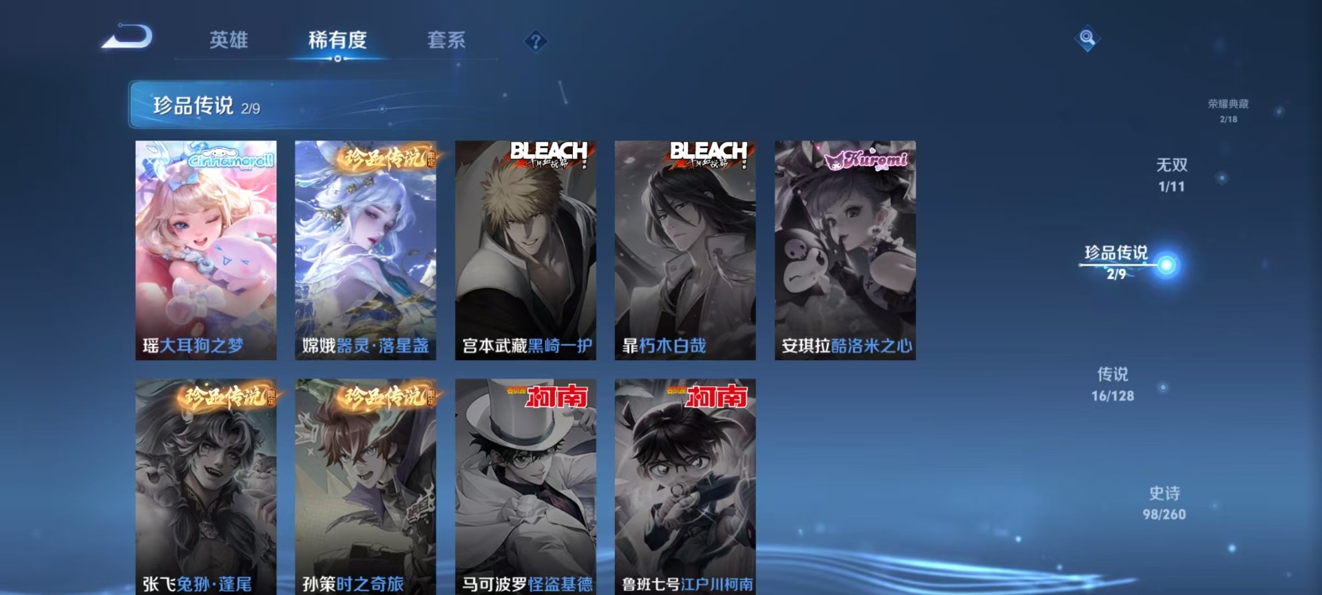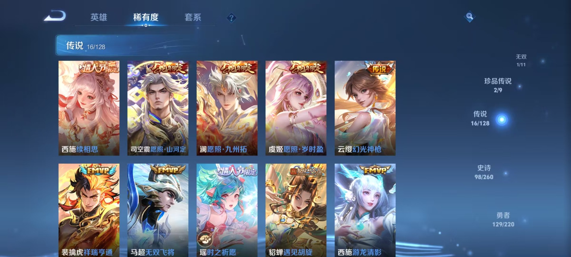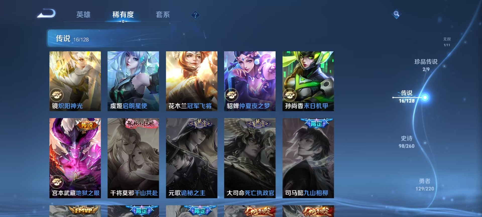 伽罗天狼溯光者,孙膑天狼运算者,孙膑寅虎·展翼,露娜一生所爱,杨玉环寅虎·心曲,司空震愿照·山河定,裴擒虎李小龙,上官婉儿天狼绘梦者,花木兰默契交锋,马可波罗山海·玄木吟,西施至美·乘鲤谣,芈月白晶晶,百里守约朱雀志,瑶时之祈愿,瑶山海·碧波行,澜愿照·九州拓,虞姬霸王别姬,虞姬愿照·岁时盈,嫦娥如梦令