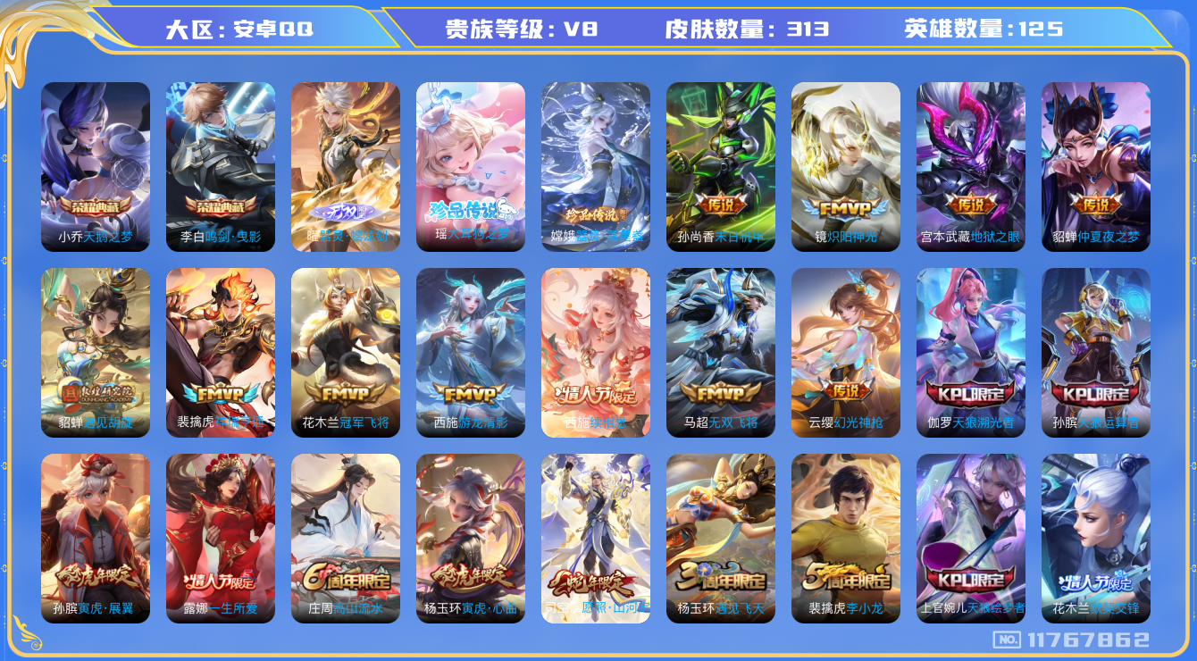 [11767862]V8 2典藏 1无双 2珍品传说 16传说 125英雄 313皮肤 可修改实名 女号 梦奇小国标 优质装备:天鹅之梦(小乔典藏),鸣剑·曳影,器灵·螭龙剑,器灵·落星盏,大耳狗之梦,冠军飞将,炽阳神光,末日机甲-孙尚香(绿蚂蚱),仲夏夜之梦(大飞蛾),地狱之眼,游龙清影(小青龙),遇见胡旋,无双飞将 传说皮:续相思,祥瑞亨通,幻光神枪 珍宝阁皮:万物之道,优雅恋人,蔷薇恋人 限定皮:愿照·九州拓(澜年限),愿照·岁时盈(虞姬年限),愿照·山河定(司空震年限),寅虎·展翼(孙膑年限),白晶晶,山海·碧波行(瑶年限),至美·乘鲤谣,遇见飞天,高山流水,五谷丰年,天狼运算者,天狼溯光者,天狼绘梦者,李小龙,朱雀志(守约年限),如梦令-嫦娥,霸王别姬-虞姬,默契交锋-花木兰,一生所爱,寅虎·心曲(虎婆),时之祈愿-瑶(瑶传限),山海·玄木吟(马可年限) 史诗皮:鸭鸭历险记-刘禅,化蝶舞,星界战将,龙之律动,茶境仙,涂山红红,东方月初,乘龙·忆丹青(大乔年限),遇见神鹿,紫霞仙子,苍穹之光,黄金分割率,千年之狐,江河有灵,魅语,百解令(蒙犽),蒙恬荣光圣徽,冰冠公主,偶像歌手,晚萤,末日机甲-吕布,猫狗日记-大乔,时之恋人-孙尚香,乱世虎臣,节奏热浪,修罗,女仆咖啡,摇滚巨星,水果甜心,绅士熊喵,天才门将,星夜王子,心灵骇客,功夫厨神,德古拉伯爵,暗隐猎兽者,幽灵船长,鬼剑武藏,暗渊魔法,天秀·启明,舞动绿茵,地狱岩魂,诗语江南,纤云弄巧,繁星吟游(呼啦呼啦),拒霜思,缤纷独角兽,乘风破浪,逐浪之夏,曙光守护者,热力回旋,箭羽风息,唤灵魅影,金属风暴,原初追逐者,圣诞狂欢,圣诞恋歌,鹰眼统帅,魅力维加斯,黎明之约,滕王阁序