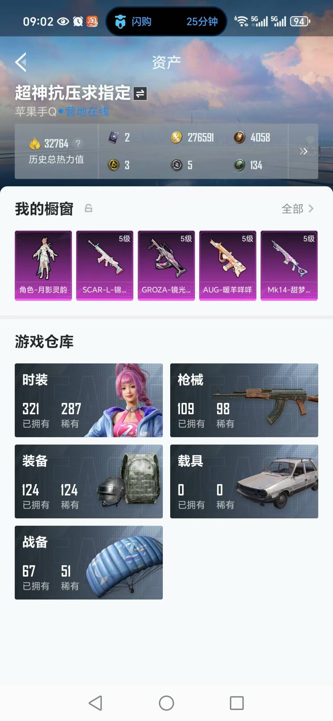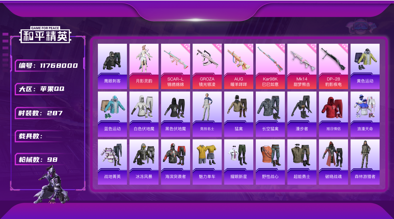 [11768000]1粉装 6特效枪 2印记 可二次 可修改实名 身法装备:Mark.06(新蓝螳螂) 优质装备:SCAR-L-锦绣绵绵,GROZA-镜光银凌,月影灵韵,AUG-暖羊咩咩,MK14-甜梦熊击,Kar98K-巳巳如意 热门装扮:鹰眼刺客 稀有枪皮:DP-28-豹影疾电 五级特效枪:五级GROZA-镜光银凌,五级Kar98K-巳巳如意,五级DP-28-豹影疾电,五级MK14-甜梦熊击,五级AUG-暖羊咩咩,五级SCAR-L-锦绣绵绵 紫色装扮:莱茵河畔,SS23特训,幻彩翩翩,妙红点点,SS21特训,SS31特训套装,旭日情侣,SS30特训套装,SS33特训套装,顶瓜瓜,SS20特训,飞驰魅影,音速流光,SS19特训,浓情蜜辣,SS18特训,野性战心,长空猛禽,缤纷果语,耀眼新星,蓝色运动,超能勇士,魅力单车,鹤鸣,黄色运动,黑色伏地魔,龟仙人,龙魂突击队,蝶变,香桃花海,熔岩游骑兵连帽夹克,柠萌假日,海滨突袭者,深蓝色名流,战地菁英,白色伏地魔,破晓战魂,王牌教练,炫蓝之夏,猛禽,粉日山川,雏菊兔兔,萝兰蝴蝶,SS29特训,星途旅人,SS28特训,Mark.06(新蓝螳螂),鱼渊荷华,燕燕于飞,巳巳如意,森林游猎者,俏兔智灵,青团波波,糖糖葫芦,竞技名士,街头风暴,SS24特训(SS24特训套装),SS27特训,浪漫天命,SS26特训,智谋强哥,大橘大利,星影赞美诗,SS32特训服(SS32特训套装),恋语绒绒,漫步者,冰冻风暴,灵符少年,光之冒险 优质战备:星途旅人降落伞,千金淑猫降落伞,幻彩电音降落伞,月影灵韵降落伞,桃粉嫣然降落伞,彩虹甜喵降落伞,幻影战神降落伞