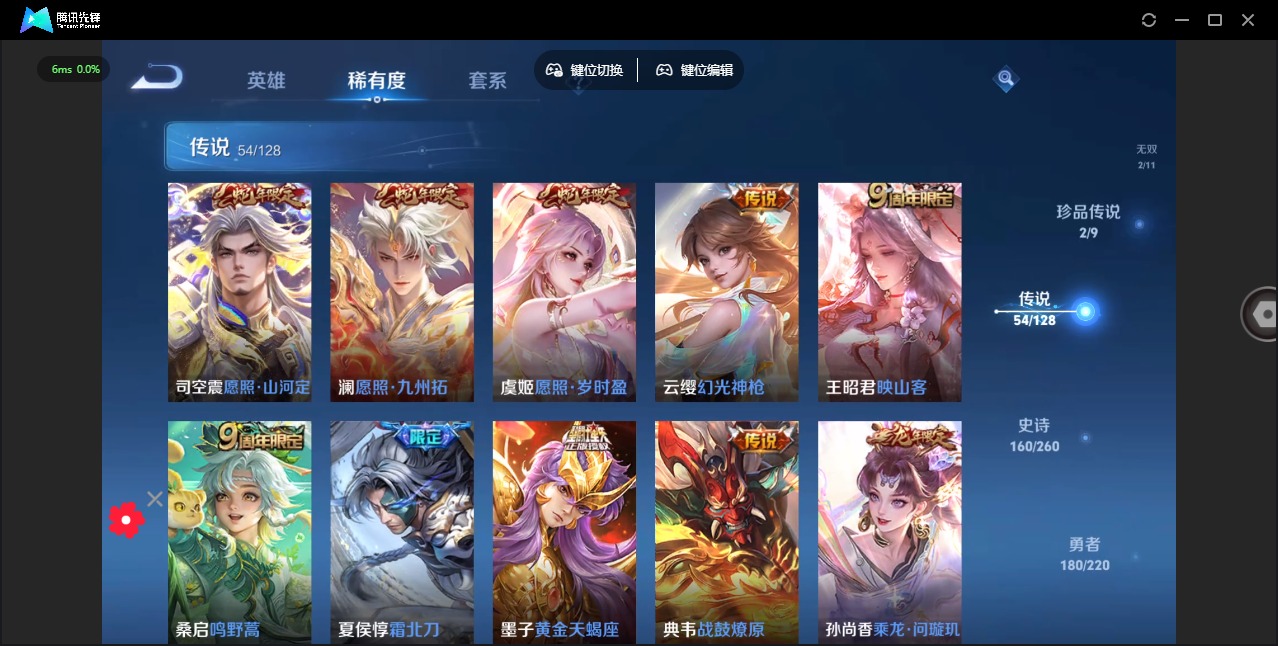 - [11853571]V8 1典藏 1无双 16传说 124英雄 269皮肤 可修改实名 优质装备:赤影疾锋,青丘·九尾(妲己无双),黄金射手座,冠军飞将,云鹰飞将(小将军),猫影幻舞,久胜战神,末日机甲-孙尚香(绿蚂蚱),地狱火,超时空战士-狄仁杰,无双飞将,山海·炽霜斩(李信年限),青丘·九尾 珍宝阁皮:妄想食味,优雅恋人,蔷薇恋人 限定皮:鸣野蒿,至尊宝,异界灵契(白毛香),瑞麟志(木兰年限),遇见飞天,高山流水,诗剑行,怒海麟威,五谷丰年,青龙志(铠年限),冰锋战神,武圣,梁祝,龙胆,李小龙,玄武志(苏烈年限),朱雀志(守约年限),孙行者 史诗皮:破空之剑,蒙犽顽岩魄,决胜骁骑,电玩小子(小书包),黄金分割率,特工魅影,魅语,无限星赏官,冰冠公主,百相守梦(关羽),末日机甲-吕布,猫狗日记-孙策,猫狗日记-大乔,时之恋人-孙尚香,乱世虎臣,节奏热浪,修罗,女仆咖啡,摇滚巨星,水果甜心,绅士熊喵,星夜王子,心灵骇客,功夫厨神,德古拉伯爵,暗隐猎兽者,鬼剑武藏,地狱岩魂,纤云弄巧,乘风破浪,逐浪之夏,水晶猎龙者,曙光守护者,箭羽风息,金属风暴,圣诞狂欢,鹰眼统帅,魅力维加斯,无心,未来纪元-赵云