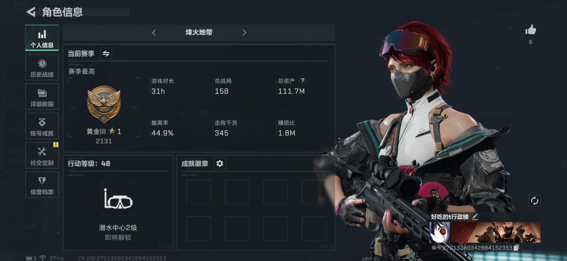 [11768703]总资产:111.7M 7传说枪械 哈夫币:64.142K 可二次 可修改实名 烽火地带段位:黄金 全面战场段位:无段位 传说武器皮肤:UZI冲锋枪-特斯拉线圈,AK-12突击步枪-特斯拉线圈,SR-3M紧凑突击步枪-特斯拉线圈,勇士冲锋枪-能天使-午夜邮差,Vector冲锋枪-能天使-午夜邮差,M4A1突击步枪-阿米娅,CAR-15突击步枪-阿米娅