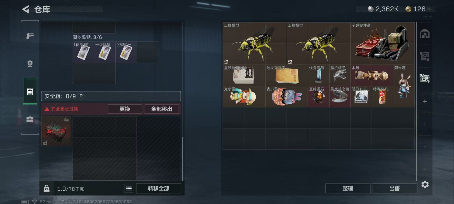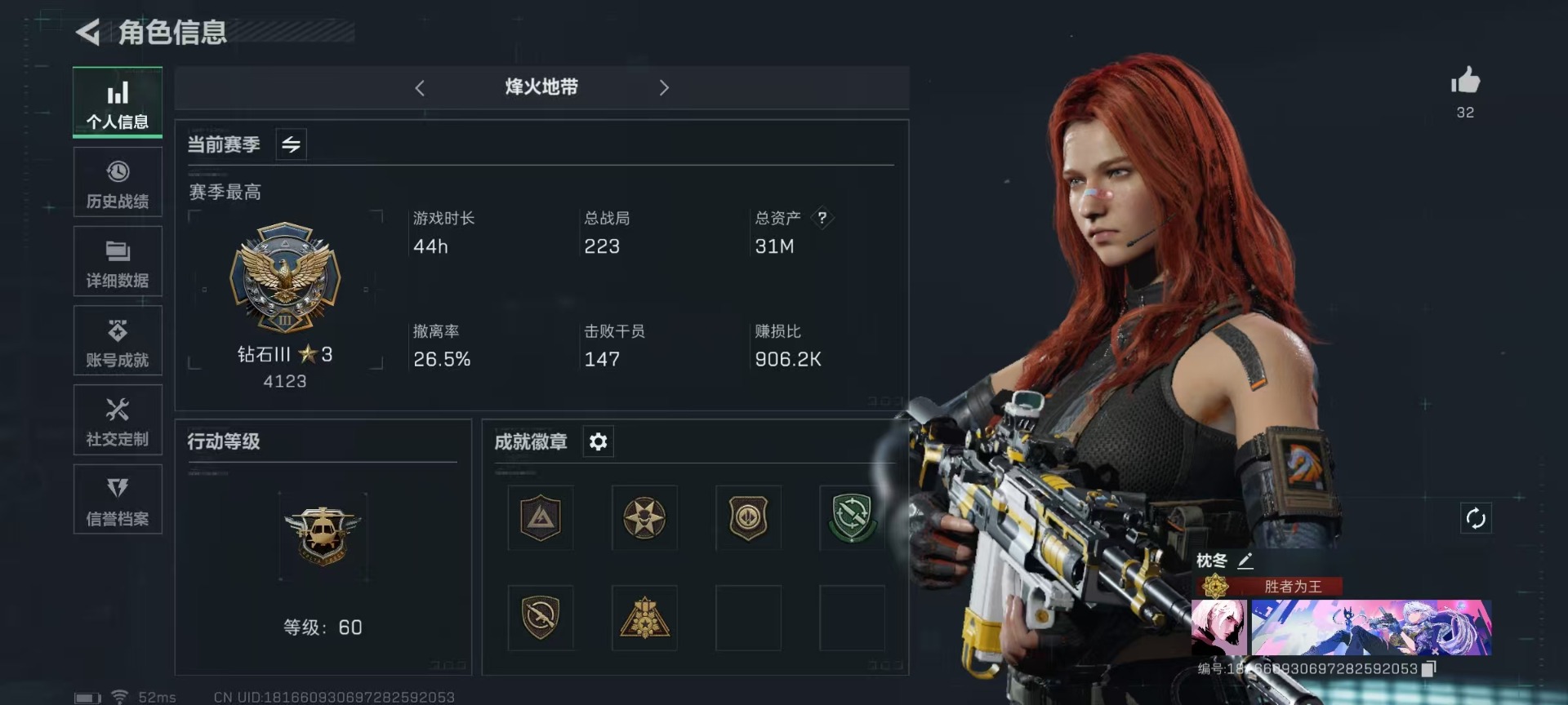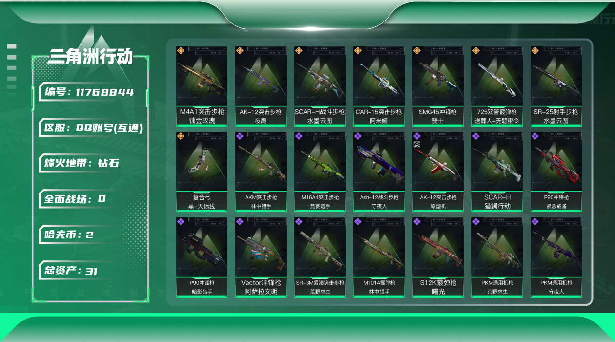 [11768844]总资产:31M 2干员外观 8传说枪械 哈夫币:2.362K 高级安全箱(2×3)9.15号到期 可二次 可修改实名 烽火地带段位:钻石 全面战场段位:尉官 传说武器皮肤:SR-25射手步枪-水墨云图,SCAR-H战斗步枪-水墨云图,SMG45冲锋枪-骑士,复合弓-黑-天际线,725双管霰弹枪-送葬人-无题密令,CAR-15突击步枪-阿米娅,AK-12突击步枪-夜鹰,M4A1突击步枪-蚀金玫瑰 史诗武器皮肤:AK-12突击步枪-原型机(典藏),M1014霰弹枪-林中猎手,P90冲锋枪-暗影猎手,PKM通用机枪-守夜人,M700狙击步枪-守夜人,Ash-12战斗步枪-守夜人,SR-25射手步枪-尖端治疗,AKM突击步枪-林中猎手,M16A4突击步枪-竞赛选手,SR-3M紧凑突击步枪-荒野求生,PKM通用机枪-荒野求生,沙漠之鹰-曙光,SCAR-H-猎鳄行动,Vector冲锋枪-阿萨拉文明,SVD狙击步枪-阿萨拉工艺,S12K霰弹枪-曙光,M700狙击步枪-竞技风,P90冲锋枪-紧急戒备 干员外观:红狼-蚀金玫瑰,骇爪-水墨云图