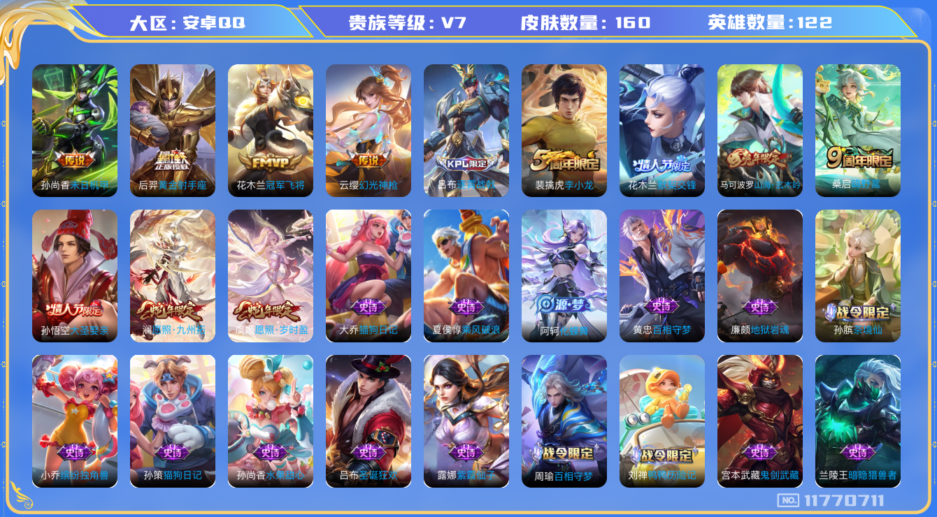 [11770711]V7 7传说 122英雄 160皮肤 可修改实名 优质装备:黄金射手座,冠军飞将,末日机甲-孙尚香(绿蚂蚱),涂山容容 传说皮:幻光神枪 珍宝阁皮:蔷薇恋人 限定皮:愿照·九州拓(澜年限),愿照·岁时盈(虞姬年限),逐霄战戟,鸣野蒿,李小龙,默契交锋-花木兰,大圣娶亲,山海·玄木吟(马可年限) 史诗皮:鸭鸭历险记-刘禅,化蝶舞,百相守梦-周瑜,茶境仙,百相守梦-百里守约,百相守梦-黄忠,织梦人,紫霞仙子,特工魅影,千年之狐,偶像歌手,猫狗日记-孙策,猫狗日记-大乔,修罗,女仆咖啡,水果甜心,星夜王子,暗隐猎兽者,鬼剑武藏,心灵战警,乐园奇幻夜,地狱岩魂,缤纷独角兽,乘风破浪,金属风暴,圣诞狂欢,鹰眼统帅,魅力维加斯,黎明之约,未来纪元-赵云