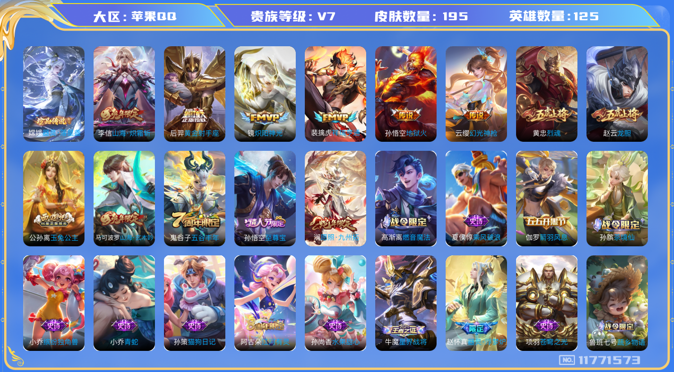 - [11796603]V7 9传说 123英雄 144皮肤 可修改实名 优质装备:一念神魔,末日机甲-孙尚香(绿蚂蚱),淬星耀世,超时空战士-狄仁杰,山海·苍雷引(电光曜子),涂山容容 传说皮:幻光神枪 珍宝阁皮:妄想食味 限定皮:愿照·九州拓(澜年限),怒海麟威,五谷丰年,逐梦之影,孙行者,匿光追影者,寅虎·赤拳(老虎年限),山海·玄木吟(马可年限) 史诗皮:紫霞仙子,苍穹之光,白龙吟,千年之狐,永昼,江河有灵,蒙恬荣光圣徽,无限星赏官,偶像歌手,晚萤,末日机甲-吕布,猫狗日记-孙策,水果甜心,绅士熊喵,功夫厨神,暗隐猎兽者,幽灵船长,鬼剑武藏,舞动绿茵,地狱岩魂,乘风破浪,逐浪之夏,水晶猎龙者,金属风暴,圣诞狂欢,鹰眼统帅,赏金猎手