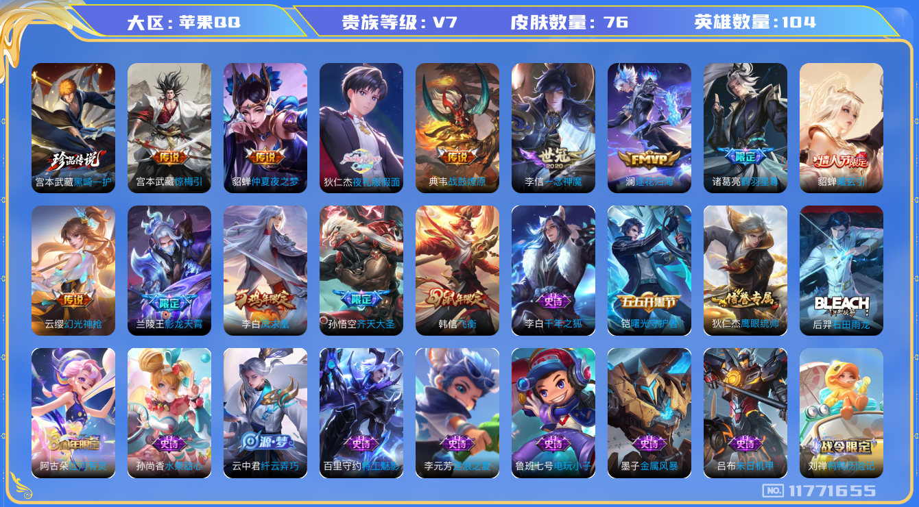 [11771655]V7 1珍品传说 12传说 104英雄 76皮肤 可修改实名 优质装备:黑崎一护,一念神魔,仲夏夜之梦(大飞蛾),鹤羽星尊,惊梅引,夜礼服假面,澜逐花归海 传说皮:貂蝉曦玄引,典韦战鼓燎原,幻光神枪 限定皮:凤求凰(白切鸡),飞衡(韩信年限),影龙天霄,齐天大圣 史诗皮:鸭鸭历险记-刘禅,石田雨龙,电玩小子(小书包),特工魅影,千年之狐,江河有灵,末日机甲-吕布,水果甜心,乐园奇幻夜,纤云弄巧,拒霜思,逐浪之夏,曙光守护者,金属风暴,鹰眼统帅