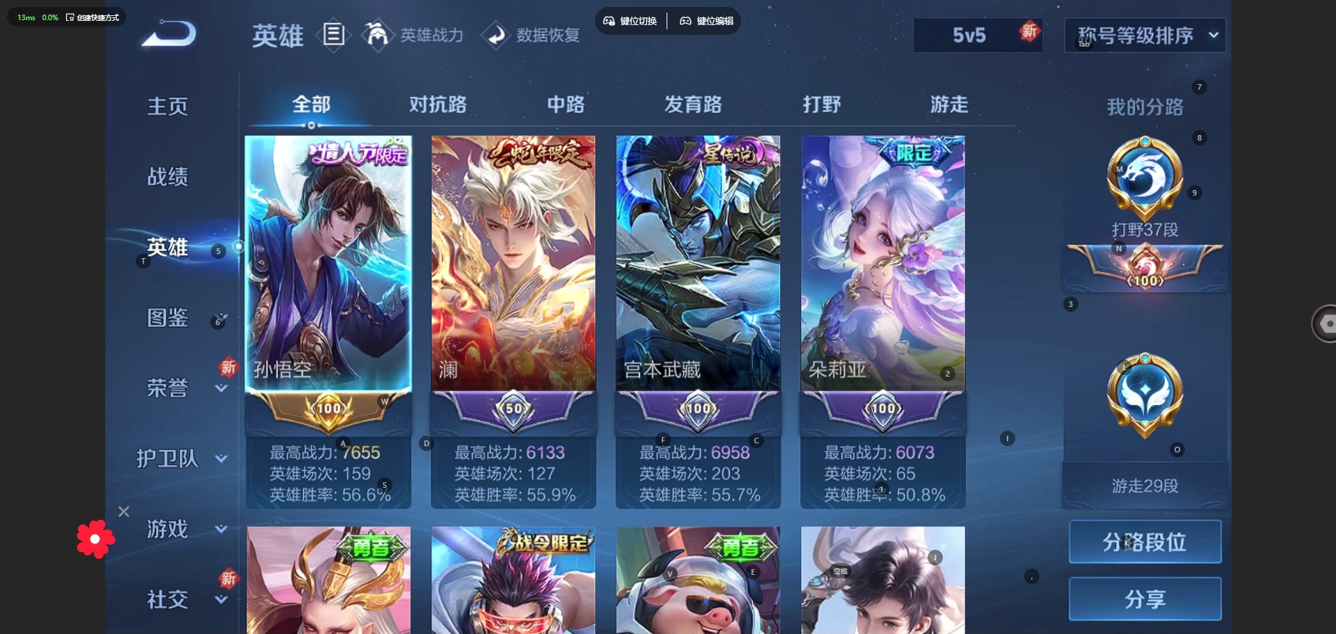 - [11530354]V7 1典藏 11传说 124英雄 291皮肤 可修改实名 优质装备:鸣剑·曳影,黄金射手座,黄金白羊座,一念神魔,仲夏夜之梦(大飞蛾),地狱之眼,澜逐花归海 传说皮:祥瑞亨通 珍宝阁皮:妄想食味,优雅恋人,蔷薇恋人 限定皮:愿照·九州拓(澜年限),愿照·岁时盈(虞姬年限),陌上桑,鸣野蒿,至尊宝,傲雪梅枪,遇见飞天,高山流水,诗剑行,五谷丰年,梁祝,李小龙,孙行者,猪悟能,大圣娶亲,神器·万象笔,山海·玄木吟(马可年限) 史诗皮:绮世丹青,化蝶舞,星界特工,星界战将,灵蛊蚀心,龙之律动,破空之剑,蒙犽顽岩魄,谪仙醉月,上官婉儿群星魔术团,炽弈燎原,百相守梦-黄忠,紫霞仙子,苍穹之光,电玩小子(小书包),白龙吟,黄金分割率,特工魅影,千年之狐,真我赫兹(镜),真我赫兹(百里守约),匿光侦查者,江河有灵,蒙恬荣光圣徽,偶像歌手,龙骑士(小龙虾),白蛇,暗夜猫娘,魅语,晚萤,冰冠公主,末日机甲-吕布,猫狗日记-孙策,时之恋人-孙尚香,乱世虎臣,节奏热浪,修罗,女仆咖啡,摇滚巨星,水果甜心,天才门将,星夜王子,心灵骇客,功夫厨神,德古拉伯爵,暗隐猎兽者,幽灵船长,鬼剑武藏,心灵战警,舞动绿茵,地狱岩魂,纤云弄巧,繁星吟游(呼啦呼啦),拒霜思,缤纷独角兽,乘风破浪,逐浪之夏,月团寄思,水晶猎龙者,曙光守护者,金属风暴,原初追逐者,圣诞狂欢,圣诞恋歌,鹰眼统帅,暗夜贵公子,魅力维加斯,黎明之约,赏金猎手,无心,未来纪元-赵云