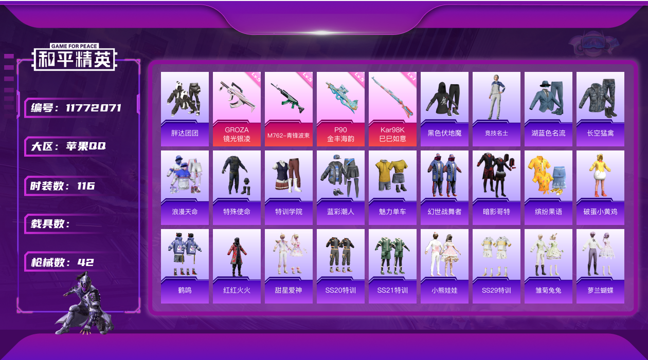 [11772071]4特效枪 2印记 可二次 可修改实名 身法装备:暗影哥特(红眼罩) 优质装备:P90-金丰海韵,M762-青锋波束,GROZA-镜光银凌,Kar98K-巳巳如意 热门装扮:胖达团团 五级特效枪:五级M762-青锋波束,五级P90-金丰海韵,五级GROZA-镜光银凌 一级特效枪:一级Kar98K-巳巳如意 紫色装扮:SS21特训,SS31特训套装,SS30特训套装,SS33特训套装,SS20特训,长空猛禽,缤纷果语,蓝彩潮人,魅力单车,鹤鸣,黑色伏地魔,幻世战舞者,湖蓝色名流,破蛋小黄鸡,特殊使命,特训学院,小熊娃娃,雏菊兔兔,萝兰蝴蝶,SS29特训,星途旅人,竞技名士,暗影哥特(红眼罩),红红火火,临安公主,小狗蛇点点,浪漫天命,甜星爱神,智谋强哥,SS32特训服(SS32特训套装) 优质战备:公主华盖飞行器,深渊漩涡飞行器,宇宙意志降落伞,忍者神龟降落伞,金丰海韵降落伞,环太平洋降落伞