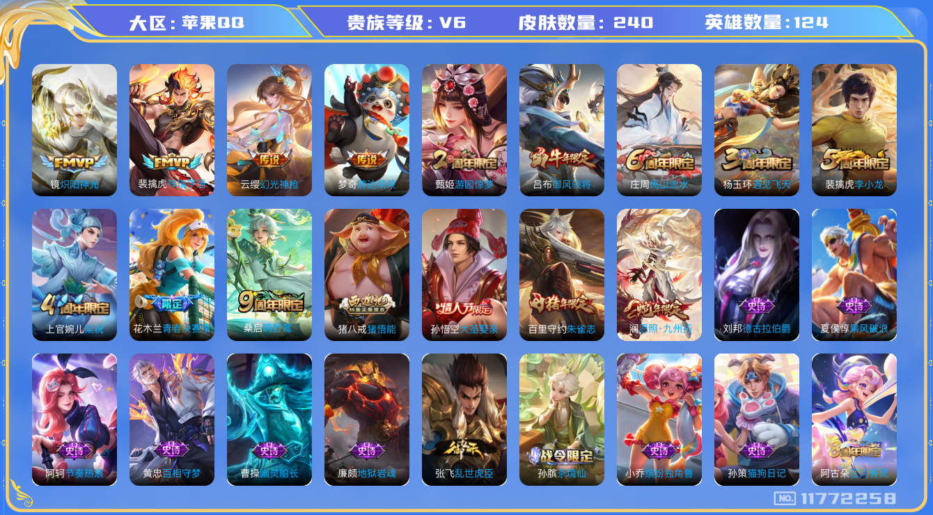 [11772258]V6 6传说 124英雄 240皮肤 可修改实名 优质装备:炽阳神光,胖达荣荣 传说皮:祥瑞亨通,幻光神枪 珍宝阁皮:优雅恋人,女武神 限定皮:愿照·九州拓(澜年限),鸣野蒿,遇见飞天,高山流水,游园惊梦,梁祝,御风骁将(吕布年限),李小龙,朱雀志(守约年限),猪悟能,大圣娶亲,青春决赛季 史诗皮:星界战将,龙之律动,茶境仙,百相守梦-黄忠,紫霞仙子,特工魅影,千年之狐,永昼,江河有灵,蒙恬荣光圣徽,无限星赏官,猫狗日记-孙策,乱世虎臣,节奏热浪,摇滚巨星,水果甜心,绅士熊喵,星夜王子,功夫厨神,德古拉伯爵,暗隐猎兽者,幽灵船长,鬼剑武藏,心灵战警,舞动绿茵,地狱岩魂,繁星吟游(呼啦呼啦),拒霜思,缤纷独角兽,乘风破浪,逐浪之夏,水晶猎龙者,金属风暴,原初追逐者,圣诞狂欢,圣诞恋歌,鹰眼统帅,魅力维加斯,黎明之约