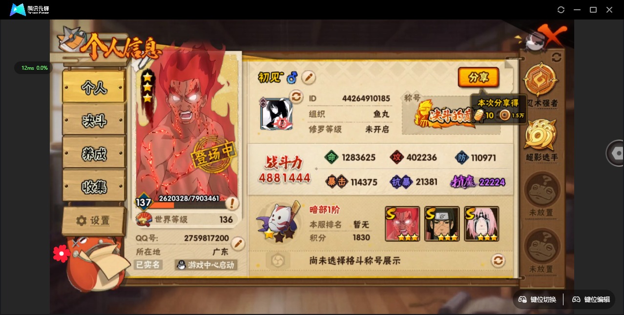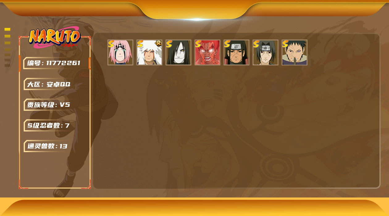 [11772261]V5 7S忍 20A忍 13通灵 488.1W战力 可二次 可修改实名 优质装备:千手柱间「秽土转生」,迈特凯「死门」,宇智波带土 「忍界大战」,春野樱 「忍界大战」 S级忍者:自来也 「舞之豪杰」,宇智波鼬 「须佐能乎」,大蛇丸