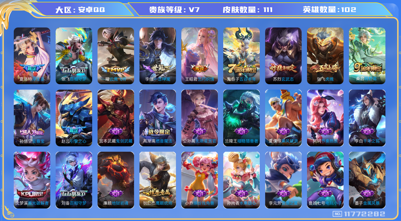 [11772282]V7 6传说 102英雄 111皮肤 可修改实名 优质装备:云鹰飞将(小将军),一念神魔,乞巧织情,浮生妄,百相守梦(张飞) 珍宝阁皮:女武神 限定皮:鸣野蒿,至尊宝,五谷丰年,虎魄,玄武志(苏烈年限),引擎之心 史诗皮:遇见神鹿,紫霞仙子,电玩小子(小书包),千年之狐,高渐离燃音魔法,无限星赏官,匿光破解者,偶像歌手,电玩·爆裂旋风,百相守梦(刘备),百相守梦(关羽),末日机甲-吕布,节奏热浪,女仆咖啡,水果甜心,暗隐猎兽者,鬼剑武藏,地狱岩魂,缤纷独角兽,乘风破浪,逐浪之夏,金属风暴,鹰眼统帅