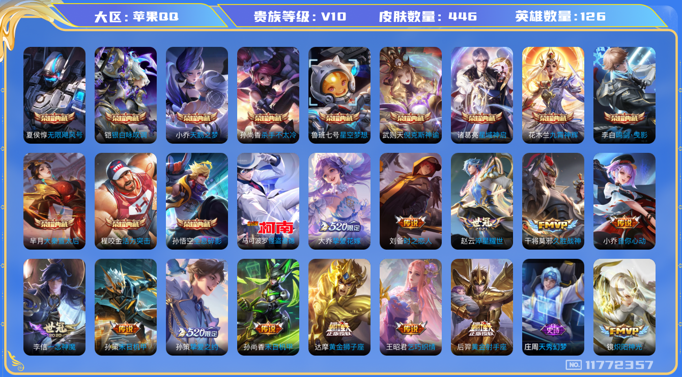 [11772357]V10 12典藏 1珍品传说 47传说 126英雄 446皮肤 典藏英雄武则天 可修改实名 优质装备:天鹅之梦(小乔典藏),星空梦想(太空人),倪克斯神谕(宇宙婆娘),无限飓风号(高达),活力突击,杀手不太冷,大秦宣太后,鸣剑·曳影,全息碎影(猴子典藏),星域神启(倪克斯贼亮),九霄神辉(木兰典藏),银白咏叹调(倪克斯侍卫),怪盗基德,黄金狮子座,黄金射手座,冠军飞将,黄金白羊座,猫影幻舞,久胜战神,炽阳神光,一念神魔,云霓雀翎,末日机甲-孙尚香(绿蚂蚱),仲夏夜之梦(大飞蛾),音你心动-小乔,海洋之心,地狱之眼,飞鸢探春,音你心动-周瑜,胖达荣荣,李逍遥,乞巧织情,时之恋人-刘备(电焊工),游龙清影(小青龙),淬星耀世,超时空战士-狄仁杰,遇见胡旋,末日机甲-孙策,花朝如约(花篮子),挚爱之约,挚爱花嫁,碎云,天秀幻梦,澜逐花归海,艾琳觅芳踪 珍宝阁皮:优雅恋人,蔷薇恋人,女武神,玩趣恶龙 限定皮:鸣野蒿,至尊宝,凤求凰(白切鸡),凤凰于飞,太华(伽罗年限),武陵仙君(小桃花),异界灵契(白毛香),傲雪梅枪,补天,寅虎·展翼(孙膑年限),时之彼端,白鹤梁神女,魔法小厨娘,白晶晶,时雨天司(水龙头),神威(电光马子),瑞麟志(木兰年限),遇见飞天,高山流水,五谷丰年,青龙志(铠年限),武圣,天狼运算者,游园惊梦,梁祝,御风骁将(吕布年限),天狼狩猎者,逐梦之星,天狼溯光者,逐梦之音,奔雷神使(牛魔年限),祈雪灵祝(雪兔子),天狼绘梦者,李小龙,玄武志(苏烈年限),朱雀志(守约年限),永曜之星,辉光之辰,如梦令-嫦娥,如梦令-后羿,霸王别姬-项羽,霸王别姬-虞姬,圣诞老人,奇迹圣诞,默契交锋-花木兰,真爱至上,纯白花嫁,孙行者,猪悟能,一生所爱,青春决赛季,冰霜恋舞曲,云端筑梦师,乒乒小将,蜜橘之夏,热情桑巴,神奇女侠,匿光追影者,女儿国国王,寅虎·御盾(廉颇年限),寅虎·瑞焰(虎皮蛋子),寅虎·心曲(虎婆),寅虎·赤拳(老虎年限),时之祈愿-云中君,时之祈愿-瑶(瑶传限),百木心枪,玉兔公主,启示之音,无尽星芒 史诗皮:星界战将,石田雨龙,遇见神鹿,紫霞仙子,苍穹之光,电玩小子(小书包),黄金分割率,特工魅影,千年之狐,永昼,江河有灵,鹤归松栖(赵怀真),魅语,蒙恬荣光圣徽,无限星赏官,冰冠公主,青蛇,偶像歌手,白蛇,晚萤,暗夜猫娘,龙骑士(小龙虾),末日机甲